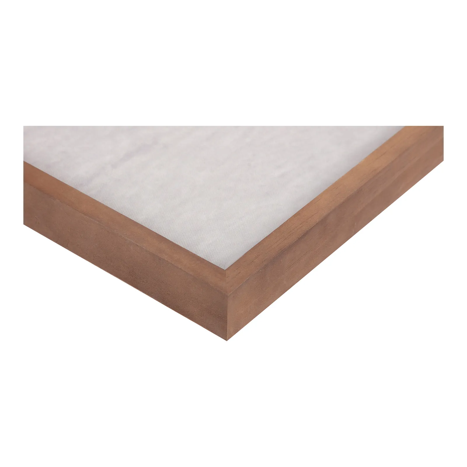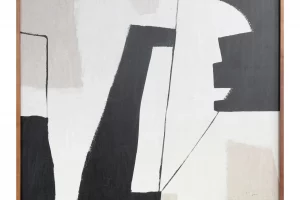Nostalgia is a piece with a familiar appeal. Abstract shapes and graphic lines are made focal against soft, warm beiges. The solid pine frame is finished in a mid-tone brown echoing mid-century modern decor.