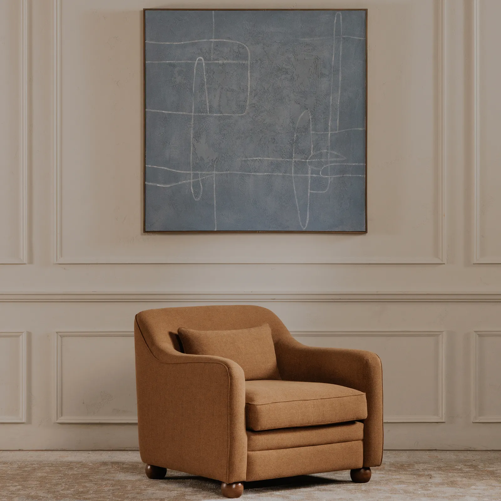 The Notion framed painting is a study in subtle sophistication. This minimalist abstract piece captivates with understated beauty and refined simplicity. Gestural lines scrawl across a cool blue canvas, creating a visual landscape that invites contemplation as textured paint adds tactile depth.