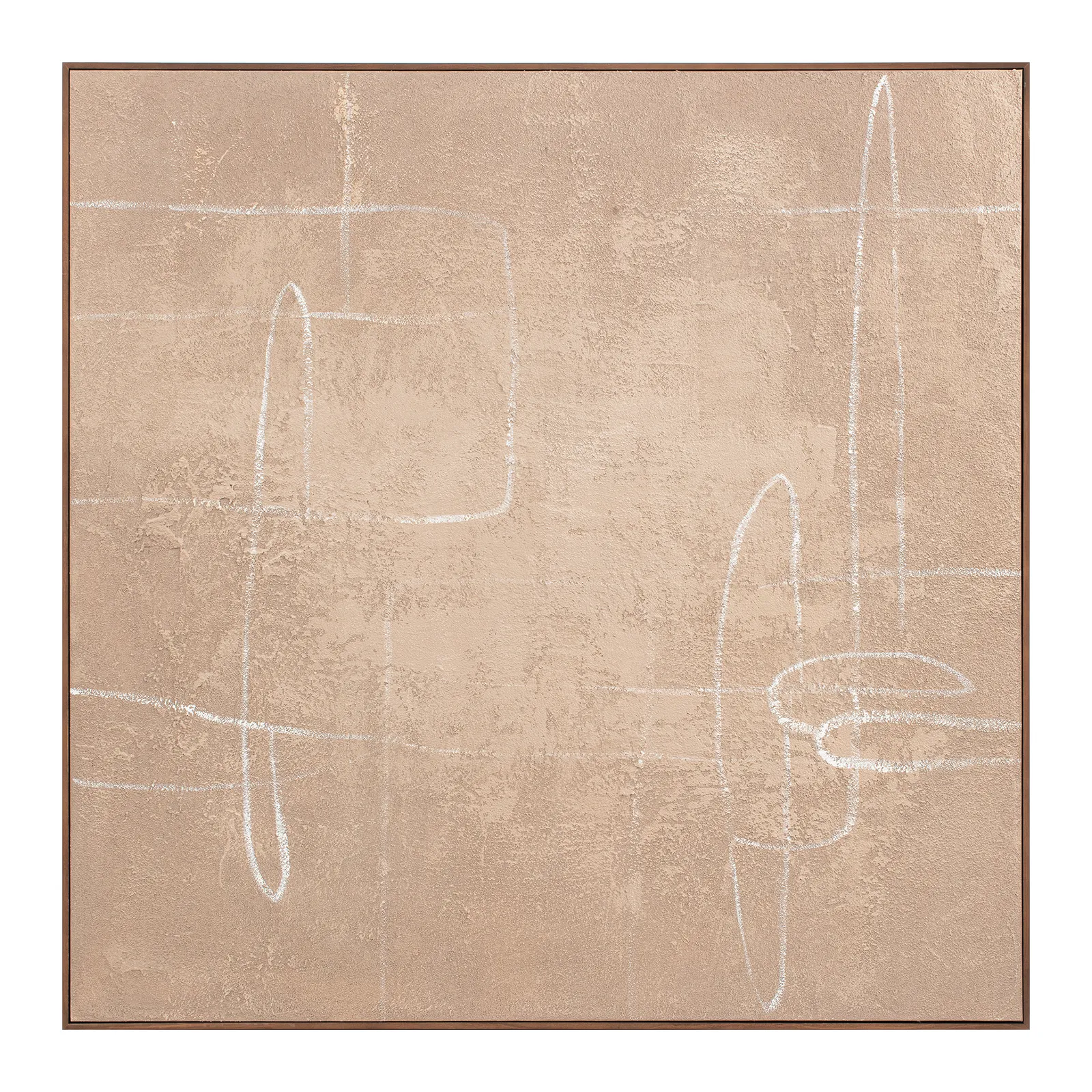 The Notion framed painting is a study in subtle sophistication. This minimalist abstract piece captivates with understated beauty and refined simplicity. Gestural lines scrawl across a neutral canvas, creating a visual landscape that invites contemplation as textured paint adds tactile depth.
