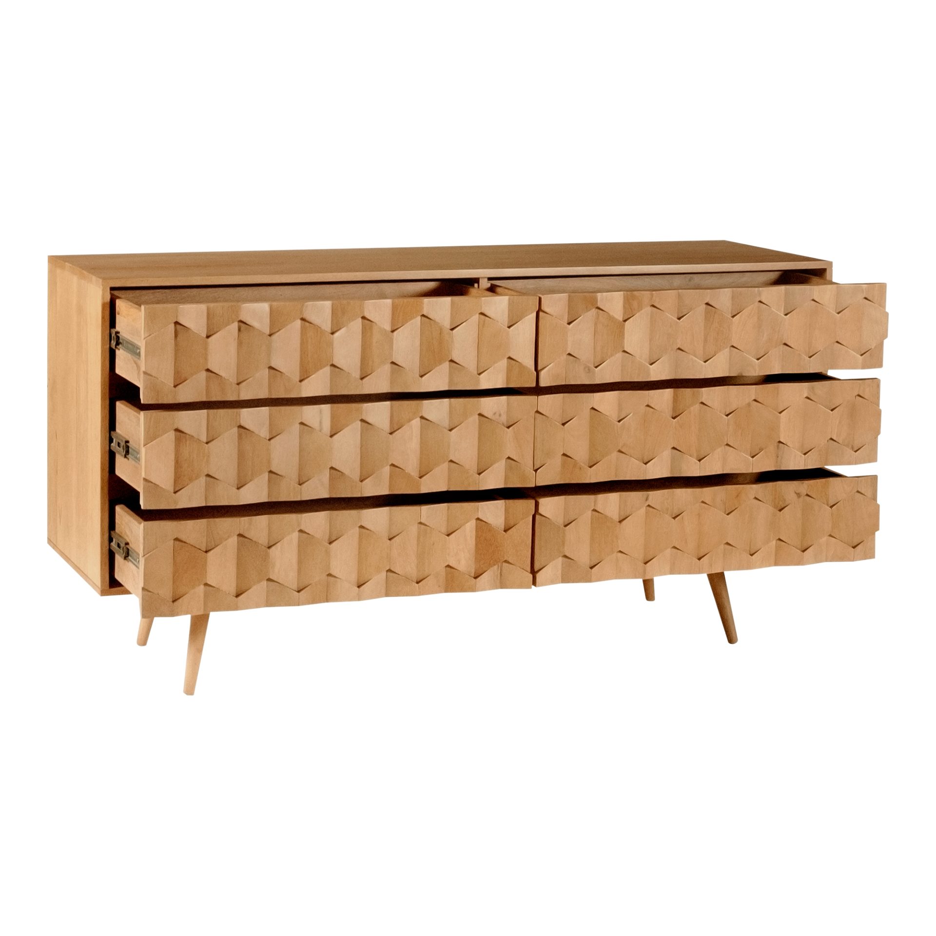 Retro-inspired with a modern twist. Constructed from solid mango wood, the O2 dresser stands bold in any bedroom area, the new home for all your favorite clothing and knickknacks. A warm tone and intricate façade provide both character and convenience, while its thin pencil-styled legs add an elegant touch. With six easy-open drawers, you’ll be saving space while basking in the organic style.