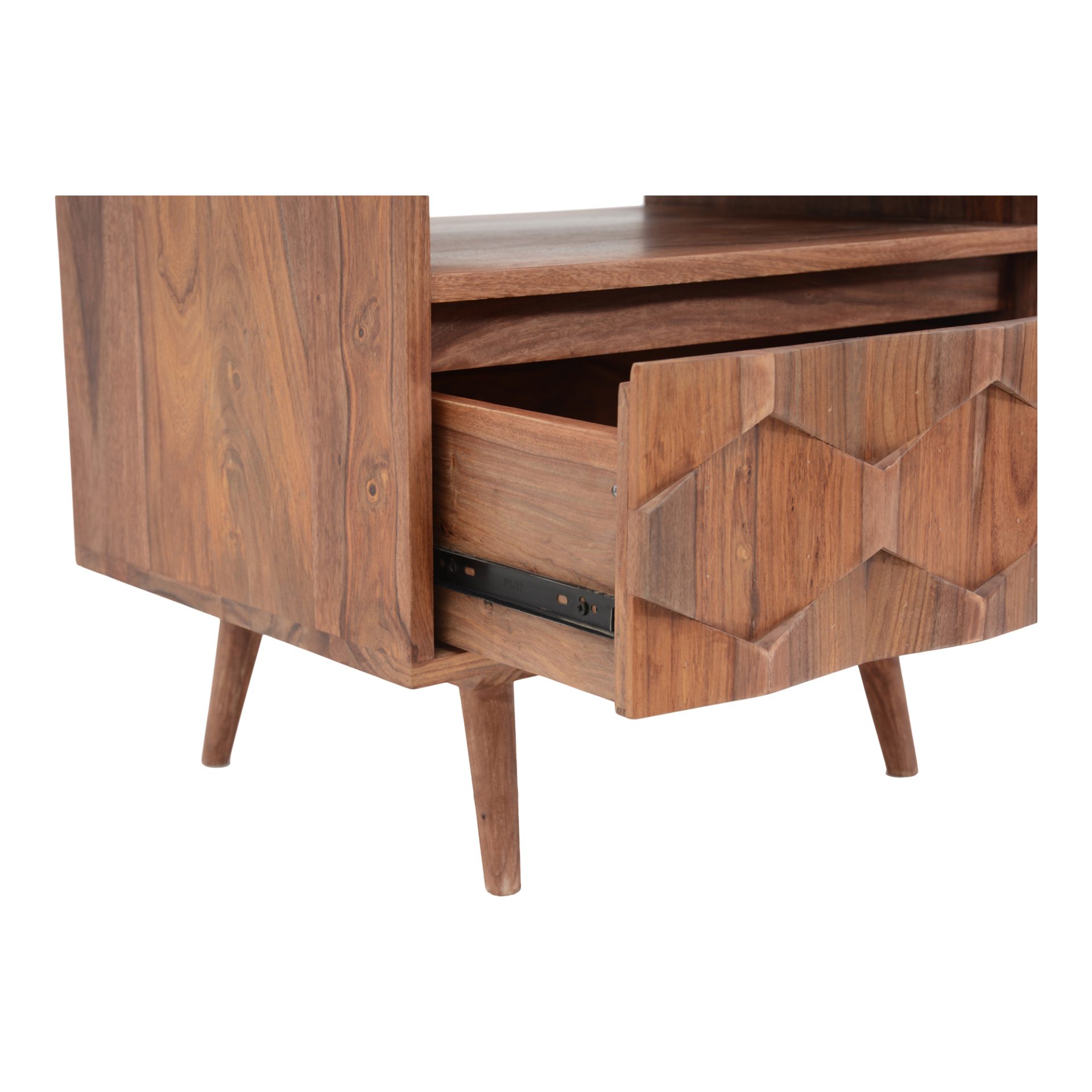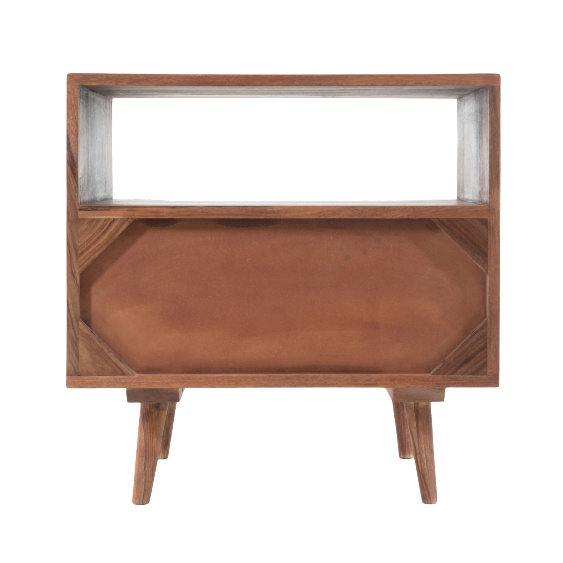 The O2 nightstand is a retro-inspired with a modern twist. Constructed with solid sheesham wood, this piece makes it resistant to major wear and tear. Its warm tone and intricate drawer front provides character and ample storage to your bedroom space.