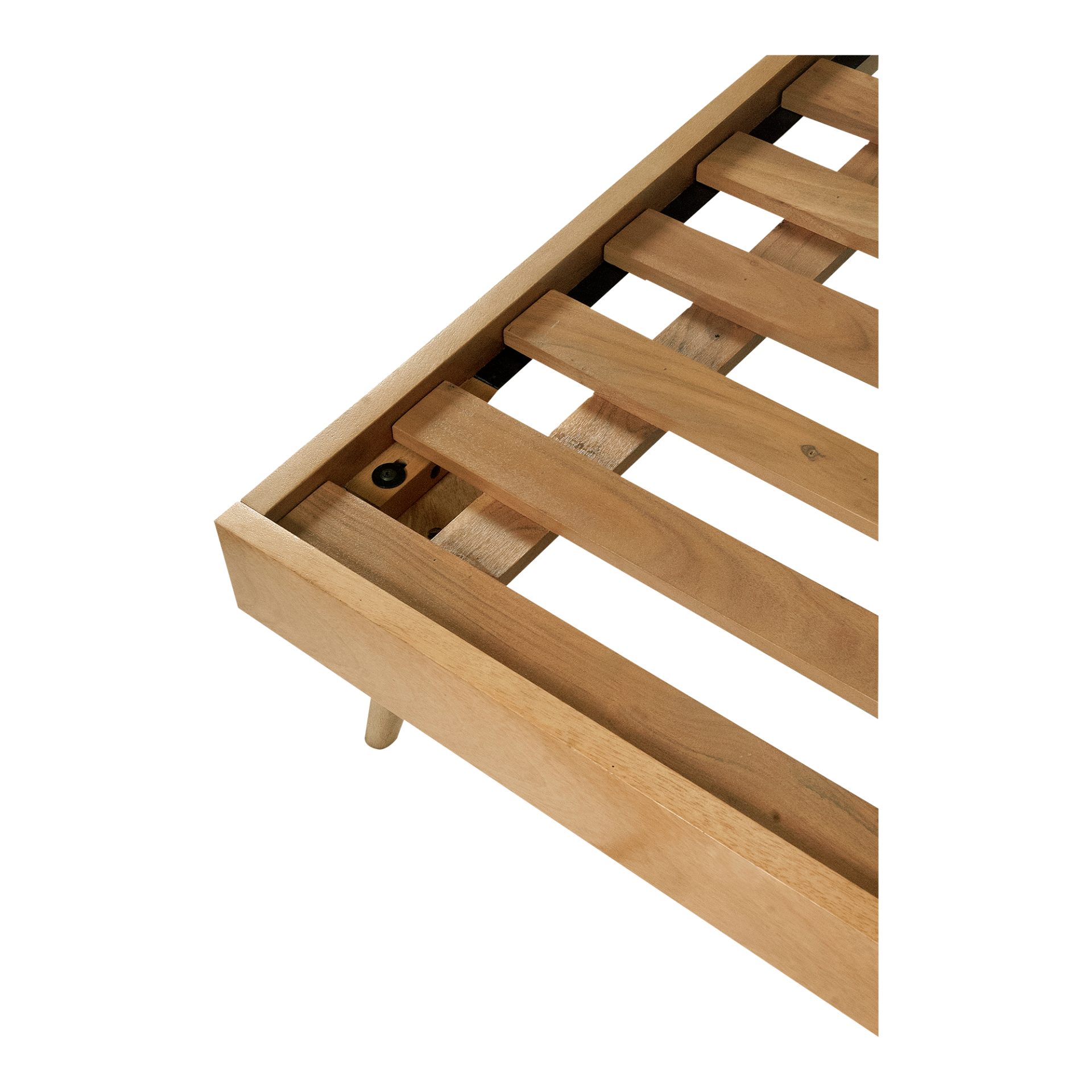 The O2 bed is retro-inspired with a modern twist. Constructed with solid mango wood with a light oak matt finish, this piece is available in queen and king. Its warm tone and intricate headboard provide character to your bedroom space while its elevated design and supportive slats ensure that no box spring is necessary.