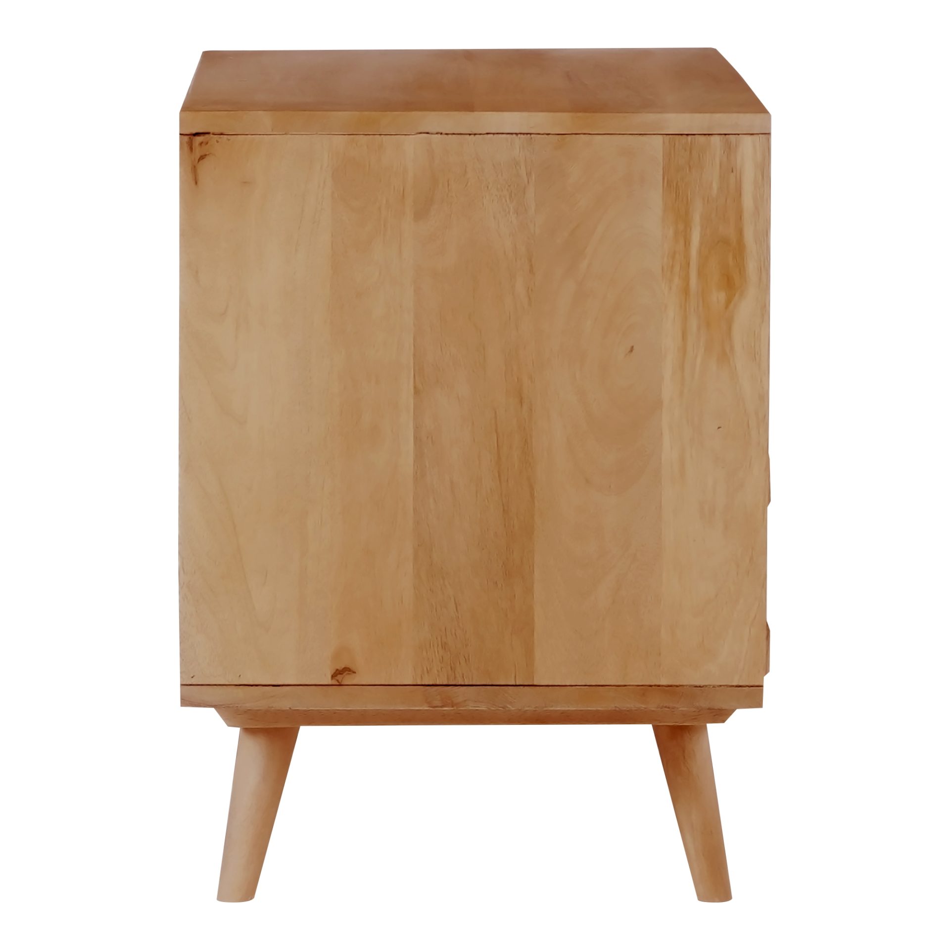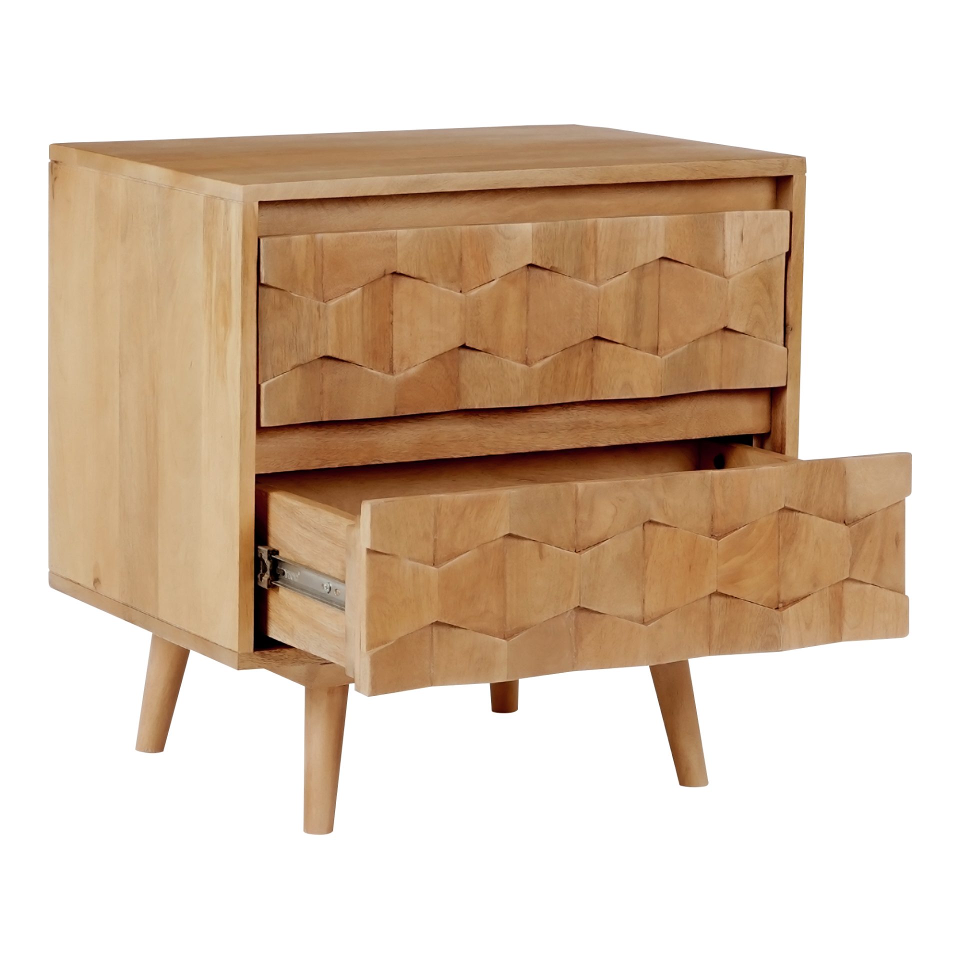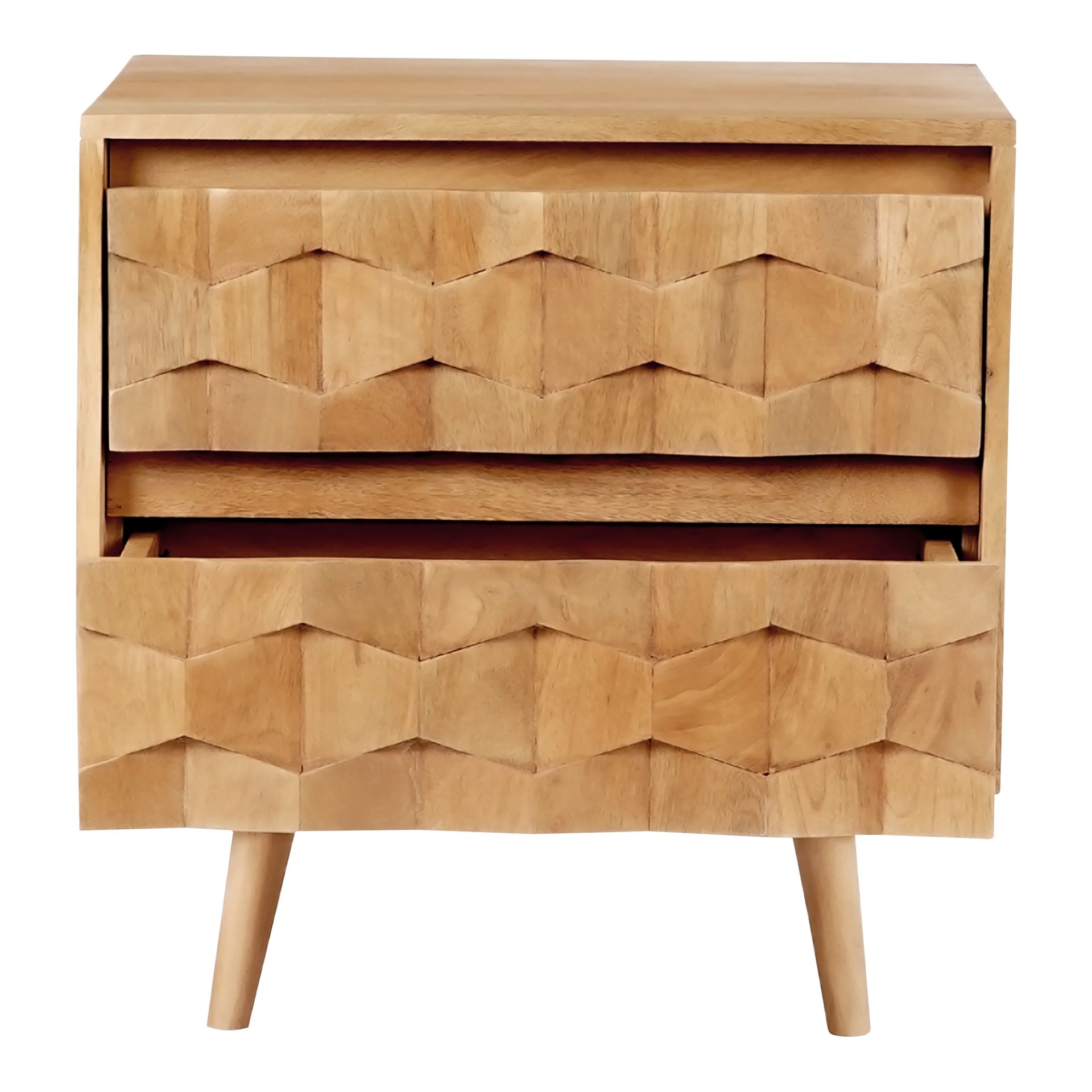 The O2 two drawer nightstand is a retro-inspired with a modern twist. Constructed with solid mango wood, this piece is resistant to major wear and tear. Its warm tone and intricate drawer detailing provide character and ample storage to your bedroom space.