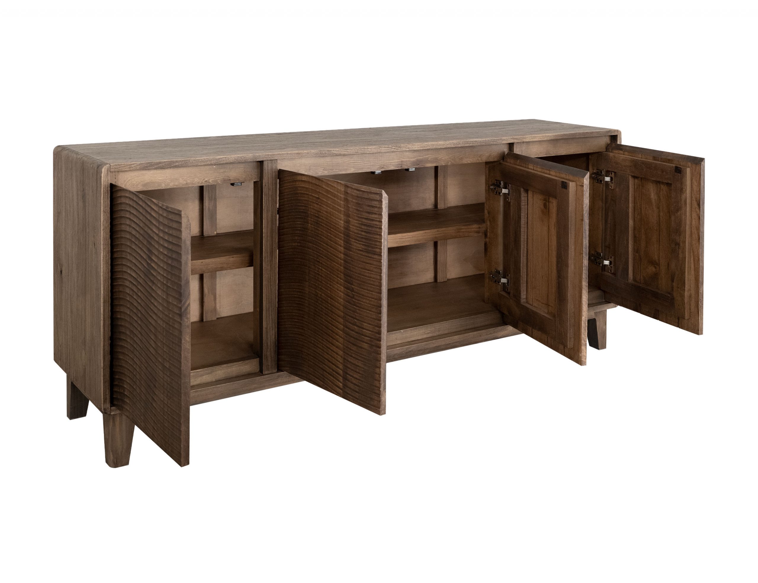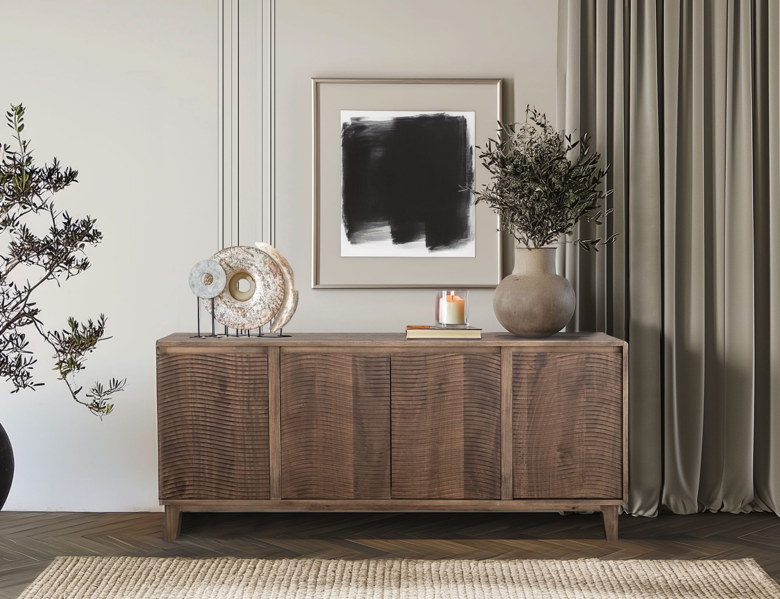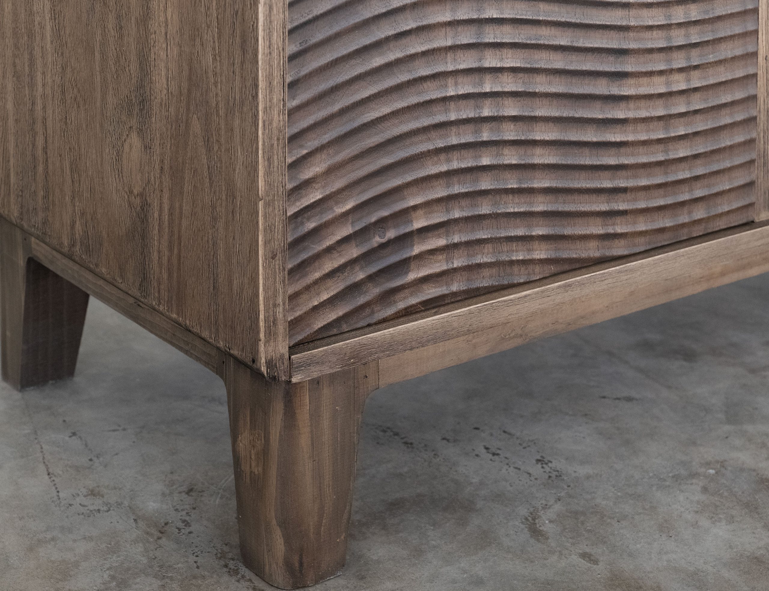 • Our Olivia collection embodies traditional mid-century furniture shapes, crafted from solid wood with a unique texture. Artisans intricately carve curves into drawer fronts and doors, inspired by ocean waves and natural textures. This brings warmth and organic charm, perfect for modern and minimalist styles, blending seamlessly with mid-century, coastal, eclectic, and modern designs.