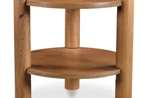 The Olsen accent table brings a vintage appeal and timeless charm, as its solid mango wood construction and warm brown finish add a rustic elegance. The cylindrical legs and meticulous joinery details are artfully incorporated alongside open storage. This piece effortlessly brings a sense of airiness and refreshing lightness to any space.