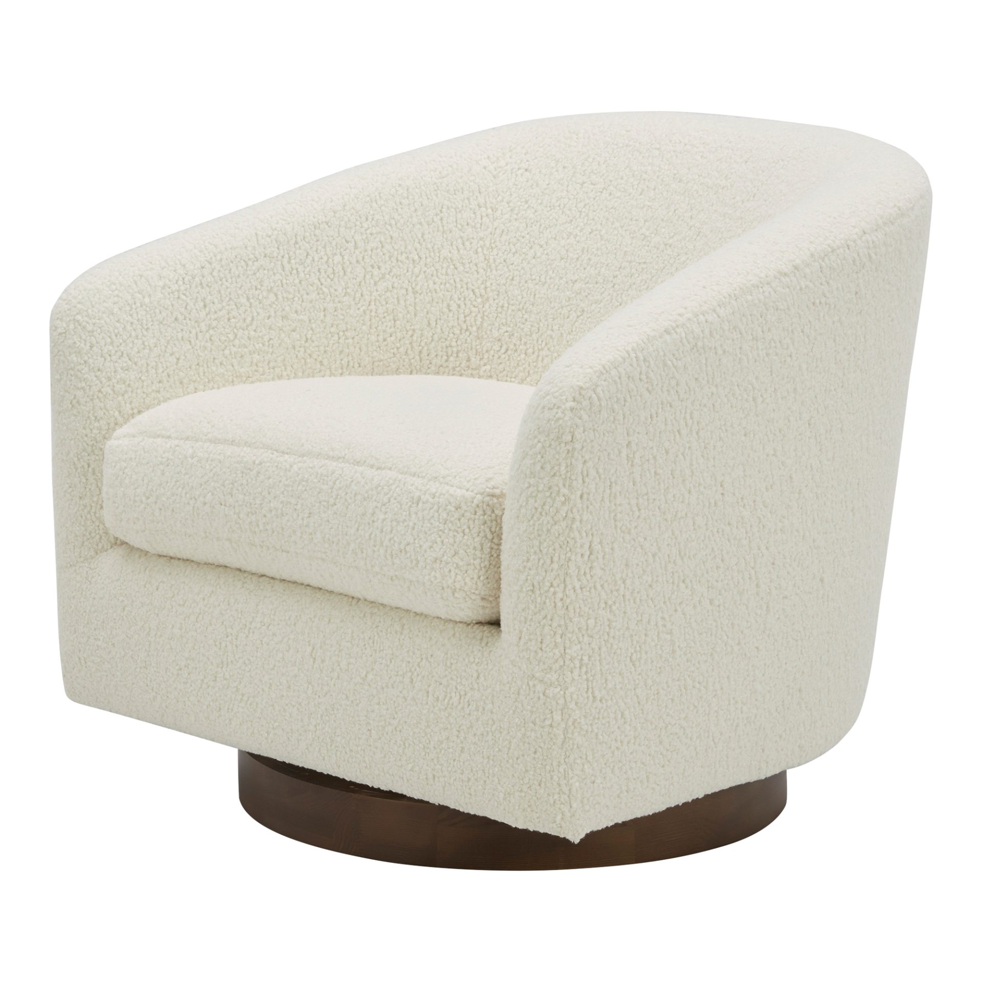 Light and cheerful. Calm and relaxed. The Oscy swivel chair is a cloud of comfort that brings airy energy and convenience into your living room with its 360° swivel, floating base design. Idyllic for a reading nook or as an accent chair, the Oscy creates a chic retreat with vegan shearling upholstery that looks fresh and feels cozy.