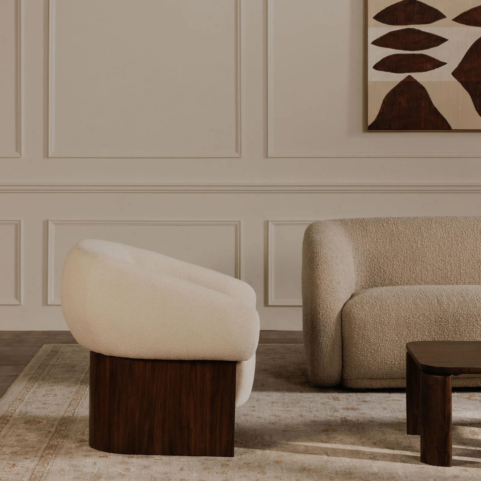 The Otto accent chair merges the robust grace of a walnut veneer over solid rubber wood base with the delicate comfort of a plush, curved back and upholstered in a flecked micro bouclé of 100% recycled GRS-certified polyester that is OEKO Tex 100. With its nuanced texture, this piece floats atop a wooden foundation that brings lightness into any space.