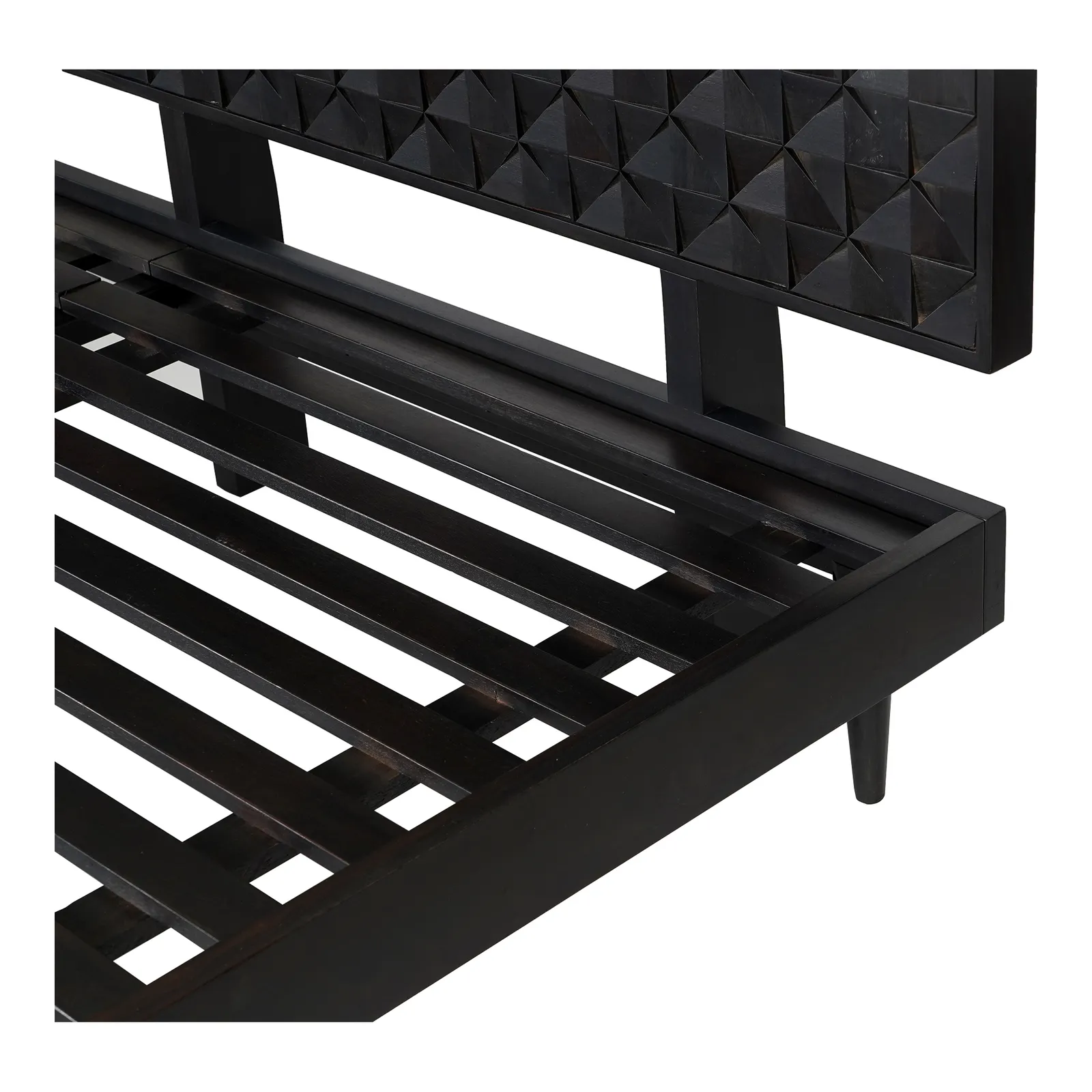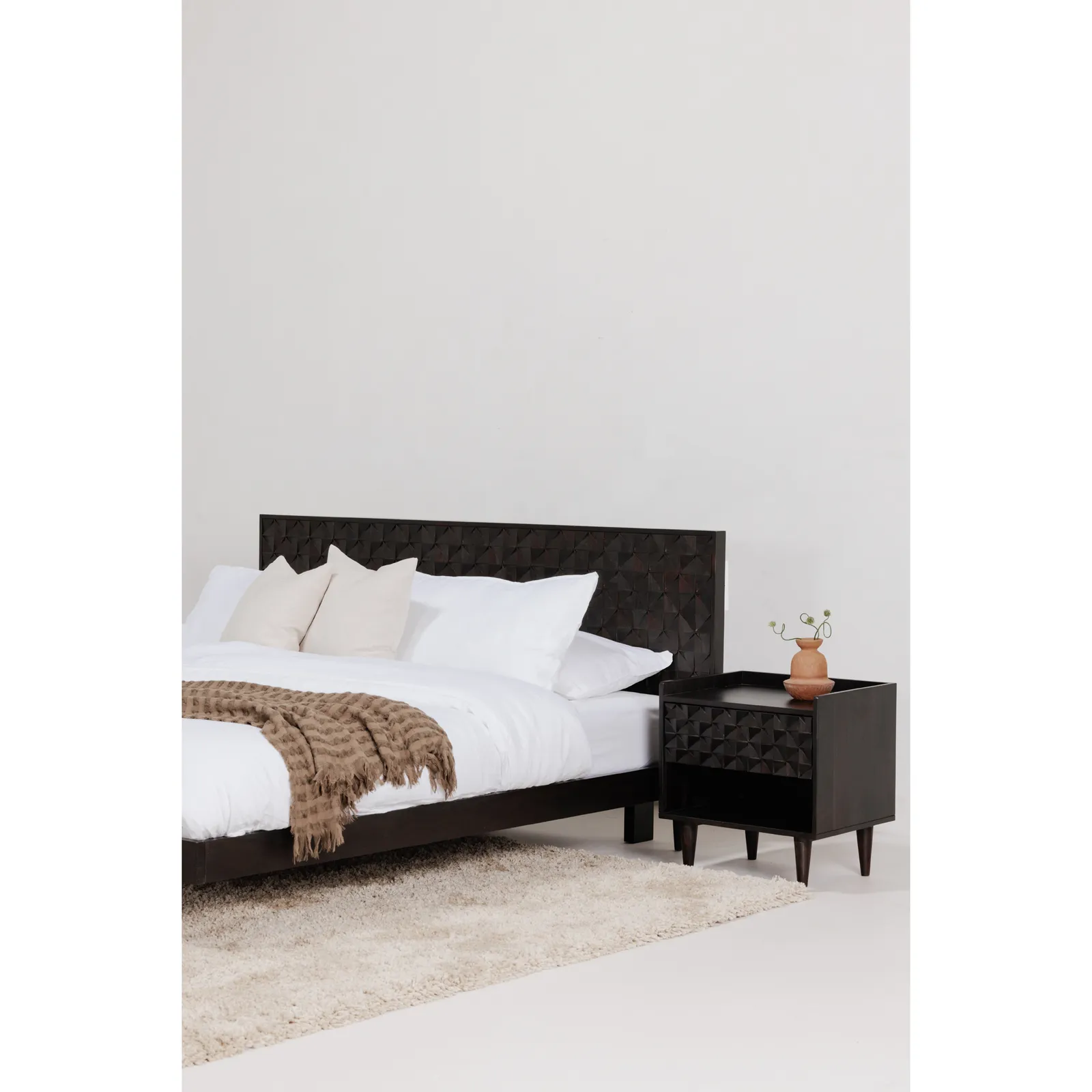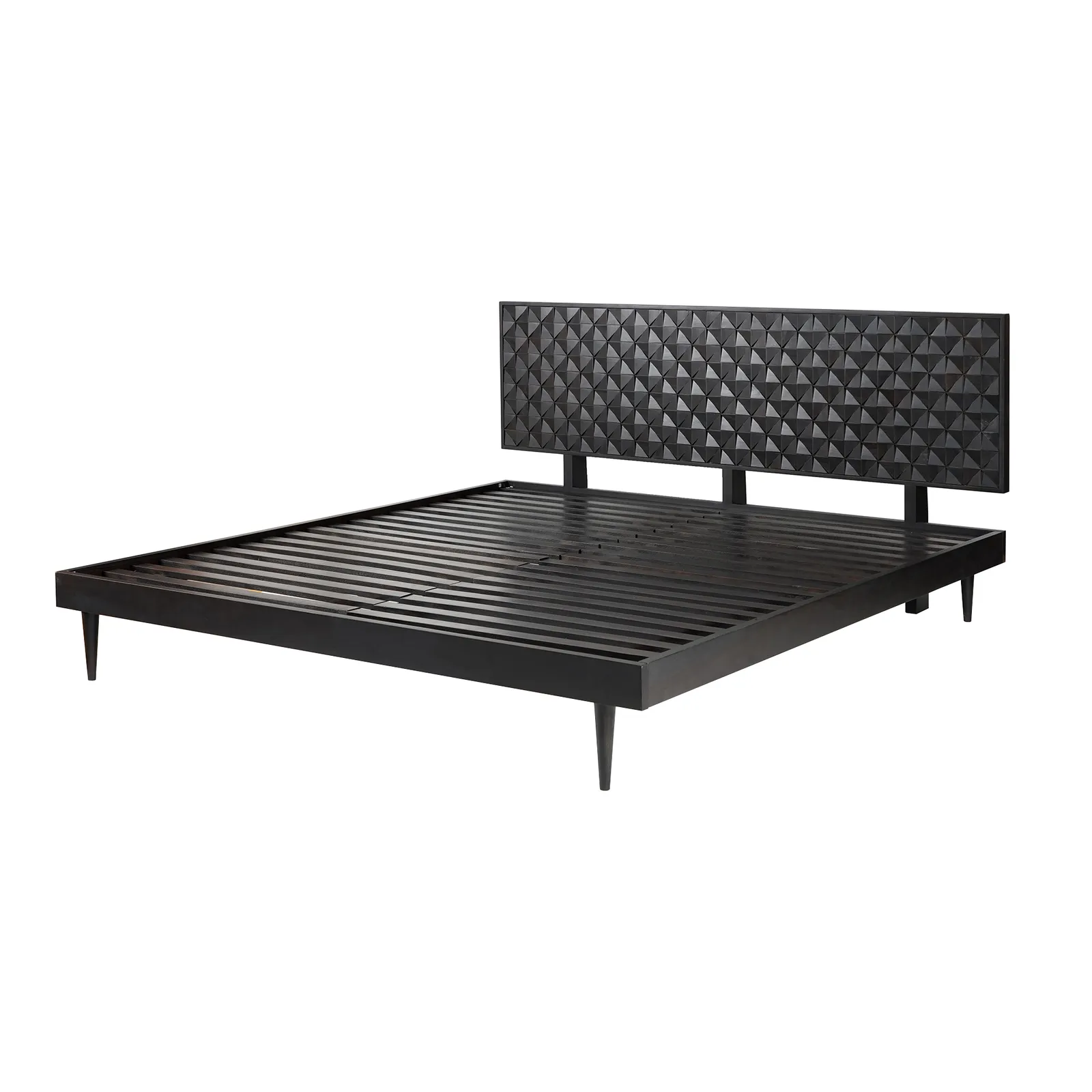Crafted in solid Sheesham wood with a black finish, the Pablo bed features an intricately designed headboard with each piece carefully arranged by hand. The texture and visual intrigue of the detailed headboard are underscored by the organic beauty of the natural wood, adding inviting warmth to the bedroom.