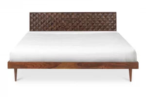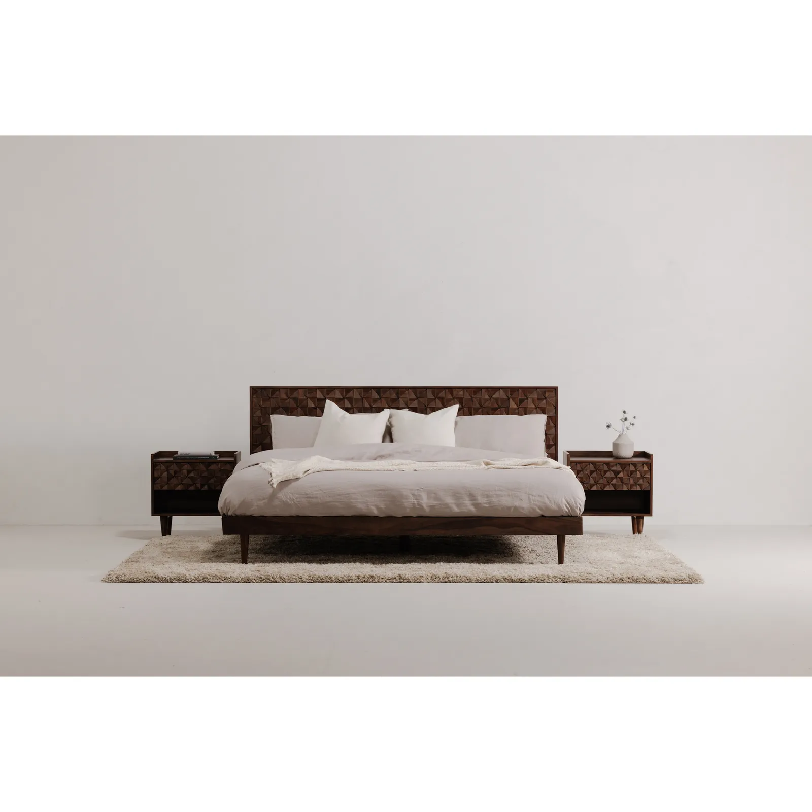 Crafted in solid Sheesham wood with a dark walnut finish, the Pablo bed features an intricately designed headboard with each piece carefully arranged by hand. The texture and visual intrigue of the detailed headboard are underscored by the organic beauty of the natural wood, adding inviting warmth to the bedroom.
