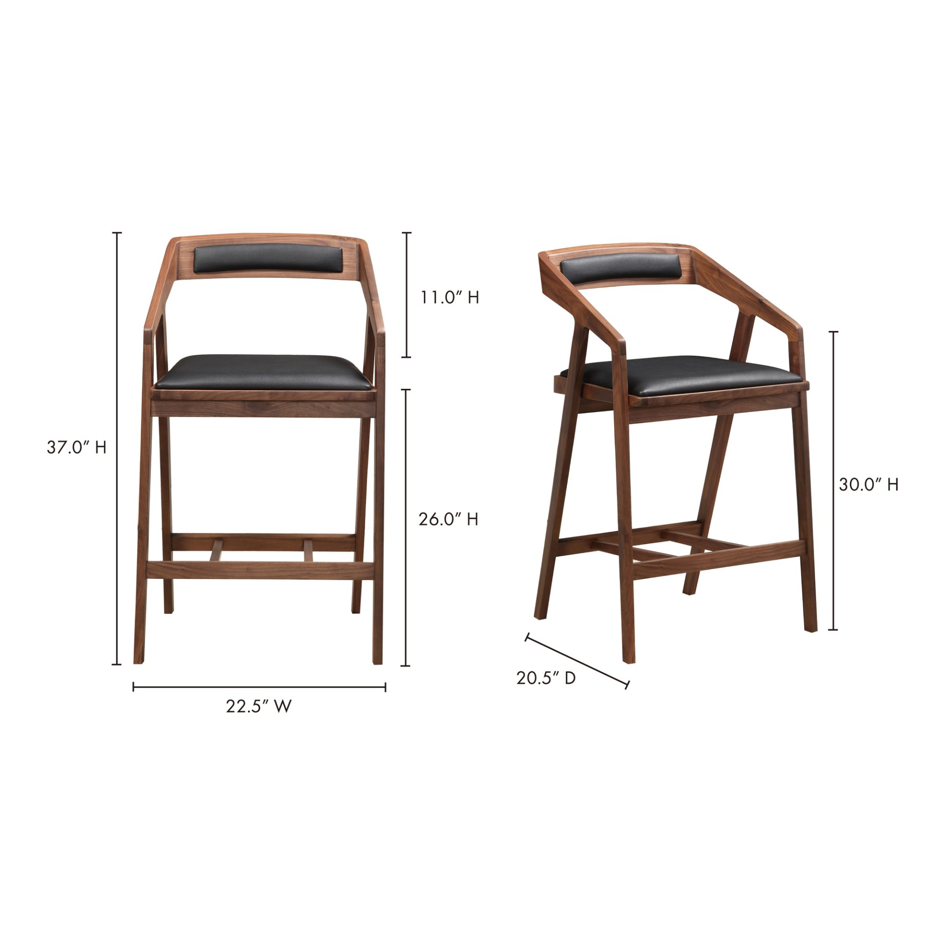 Streamlined with all the mid-century modern vibes you can settle right into, the Padma counter stool brings ultimate comfort with its supportive backrest, casual footrest, and sloped arm design. Clean lines meet sleek, minimalist form with its oak frame, flared back leg, and tonal vegan leather upholstery. An ideal, versatile addition to have float around your kitchen counter or social space.