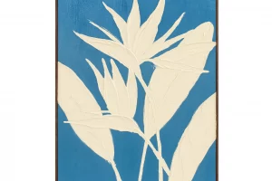 The Paradis framed painting captures the vibrant essence of the bird of paradise flower through its expressive shape and bold angular form. Set against a solid, rich blue background, the artwork’s textured paintwork creates a striking inverse silhouette, where bright light plays the defining role instead of dark shadow.