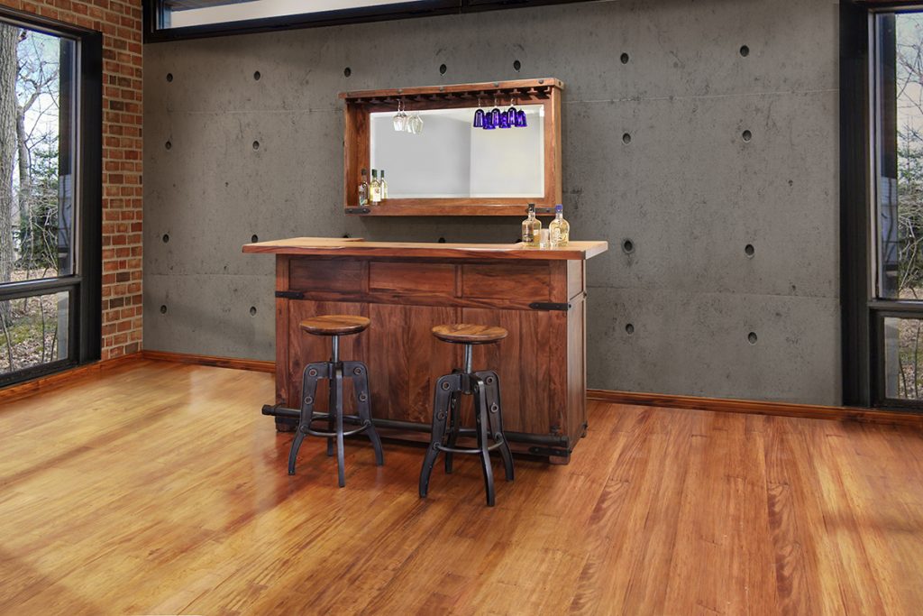 • The Parota barstool showcases a padded faux leather seat, embodying a timeless aesthetic and comfort. Its robust wooden frame, complete with a supportive backrest, ensures durability.