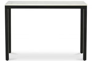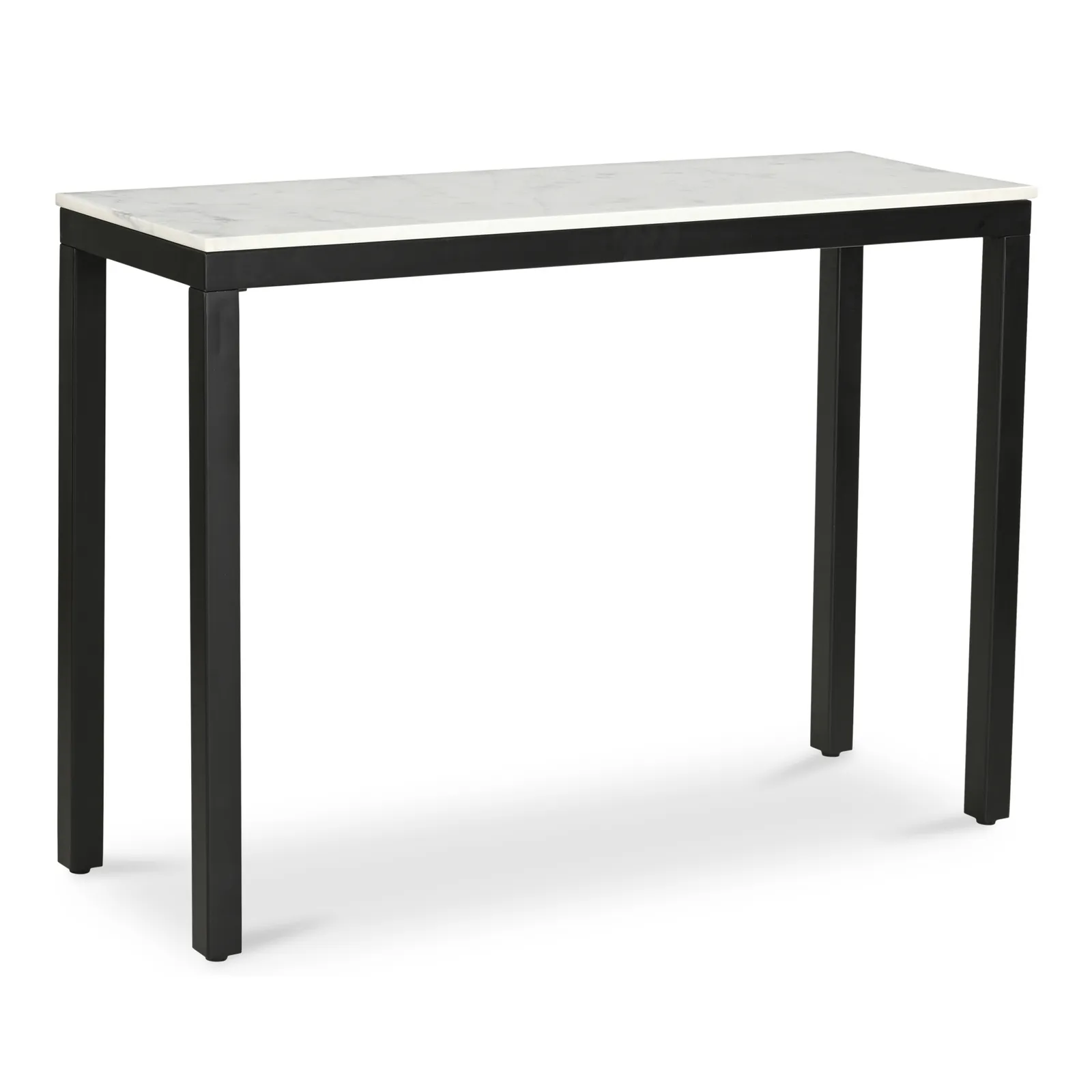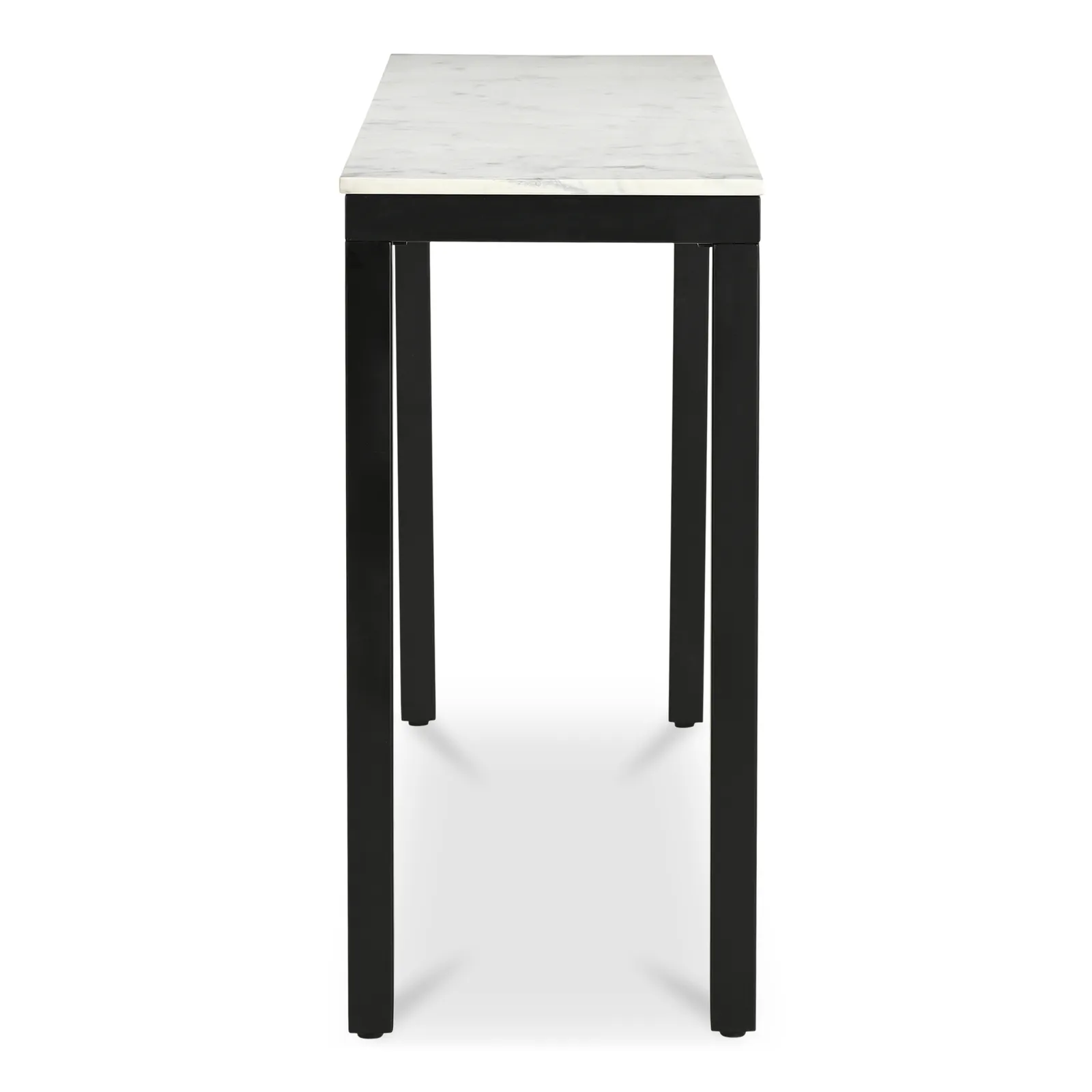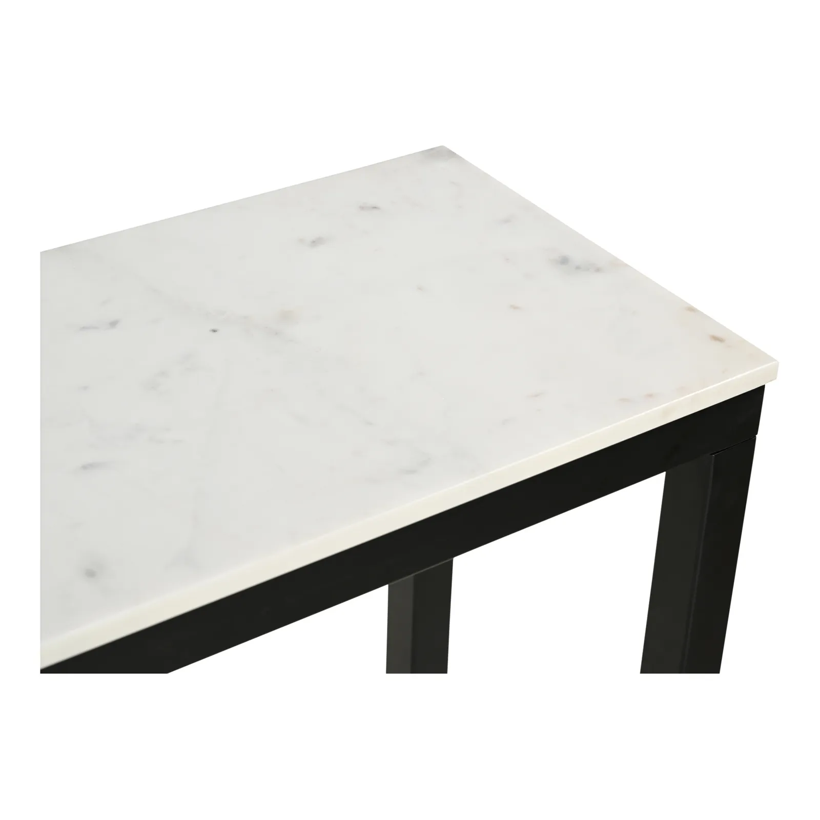 A simple, contemporary design that works in the entryway or home workspace, the Parson marble console table focuses on mixed material, pairing a natural white Banswara marble top with a sleek black powder-coated iron frame. Whether as a work desk or for display, the beauty of natural marble takes center stage with each piece’s unique color variation and veining as narrow clean lines promote open space and lightness.