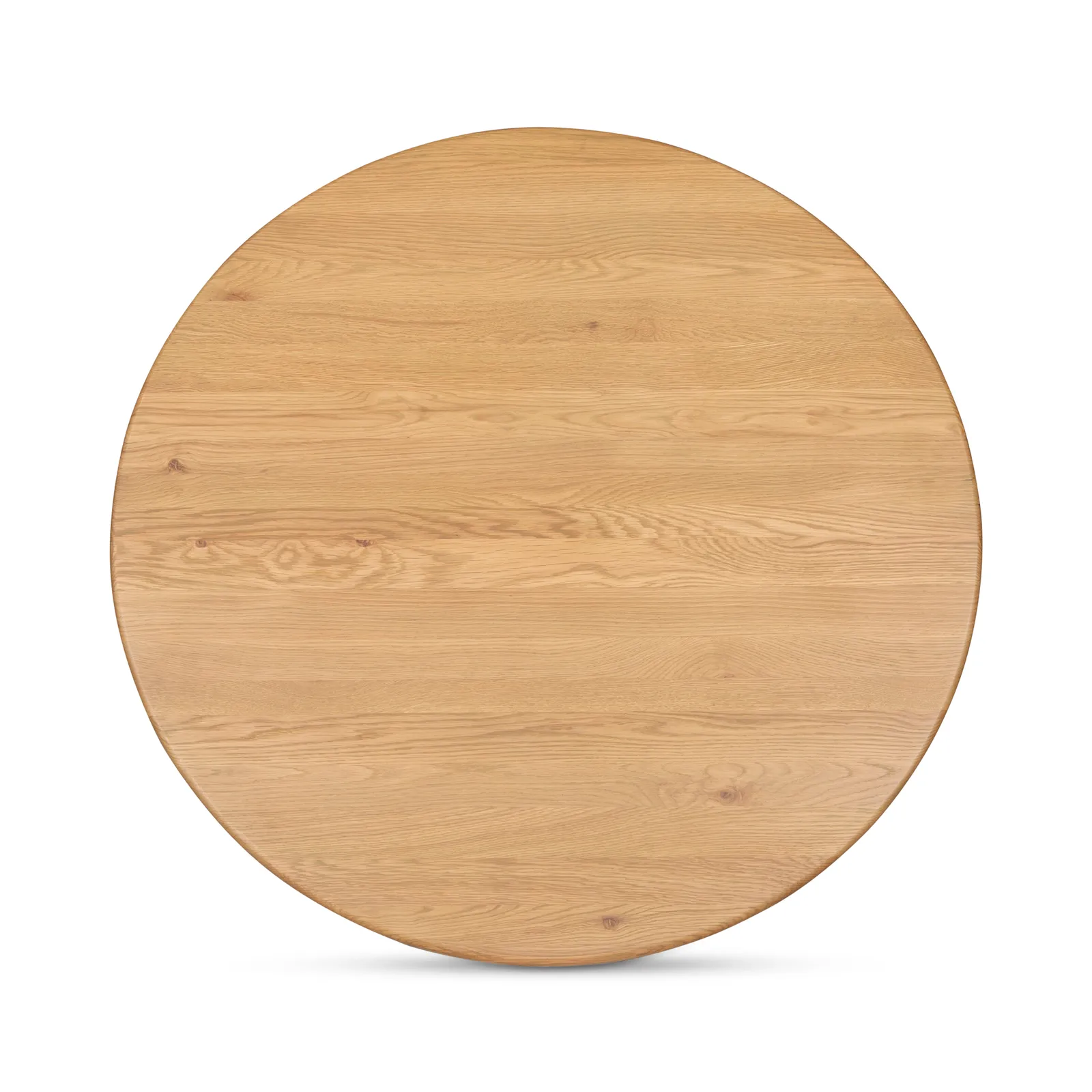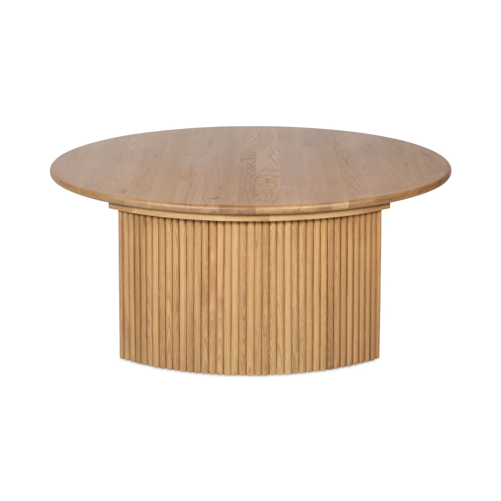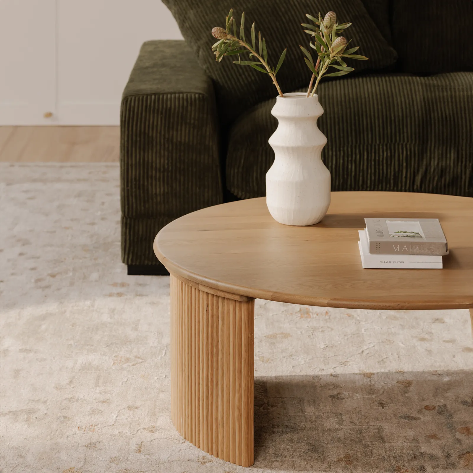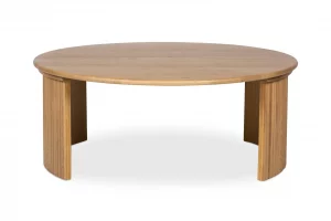 The Penny coffee table’s nesting design showcases a circular tabletop with a refined bullnose edge set upon two curved bases adorned with playful, fluted detailing. These solid oak tables infuse dynamic visual interest with the smaller table designed to nest perfectly under the larger one–a harmonious blend of rustic charm and contemporary elegance.