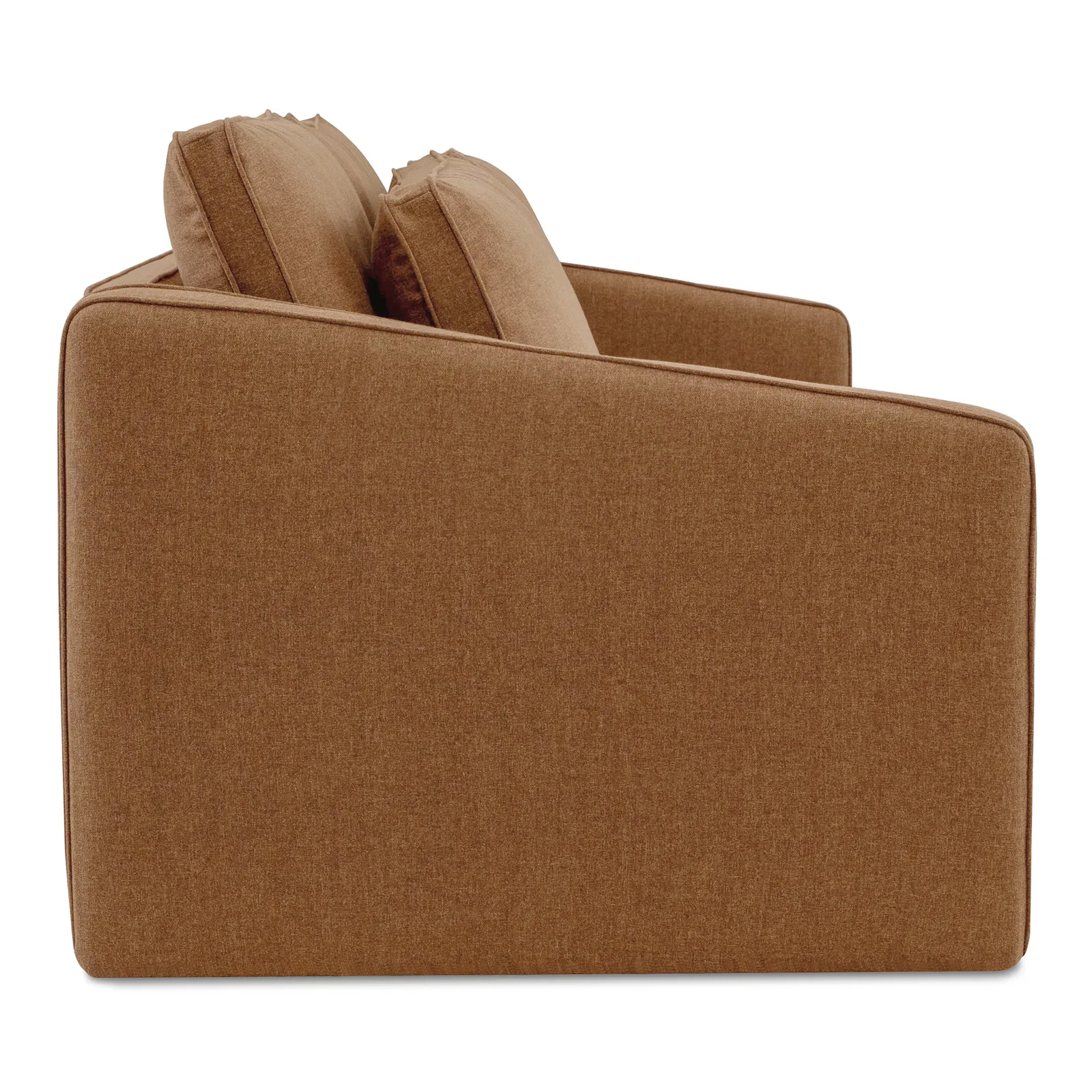 The Phoebe sofa in rust embodies transitional elegance with its minimalist form and tapered arms. The linear form is softened by a plush, feather-topped bench seat. Delicate piping adorns the arms and layered back cushions, adding tailored finesse. Upholstered in a soft, durable C0 performance fabric, it marries style with practicality.