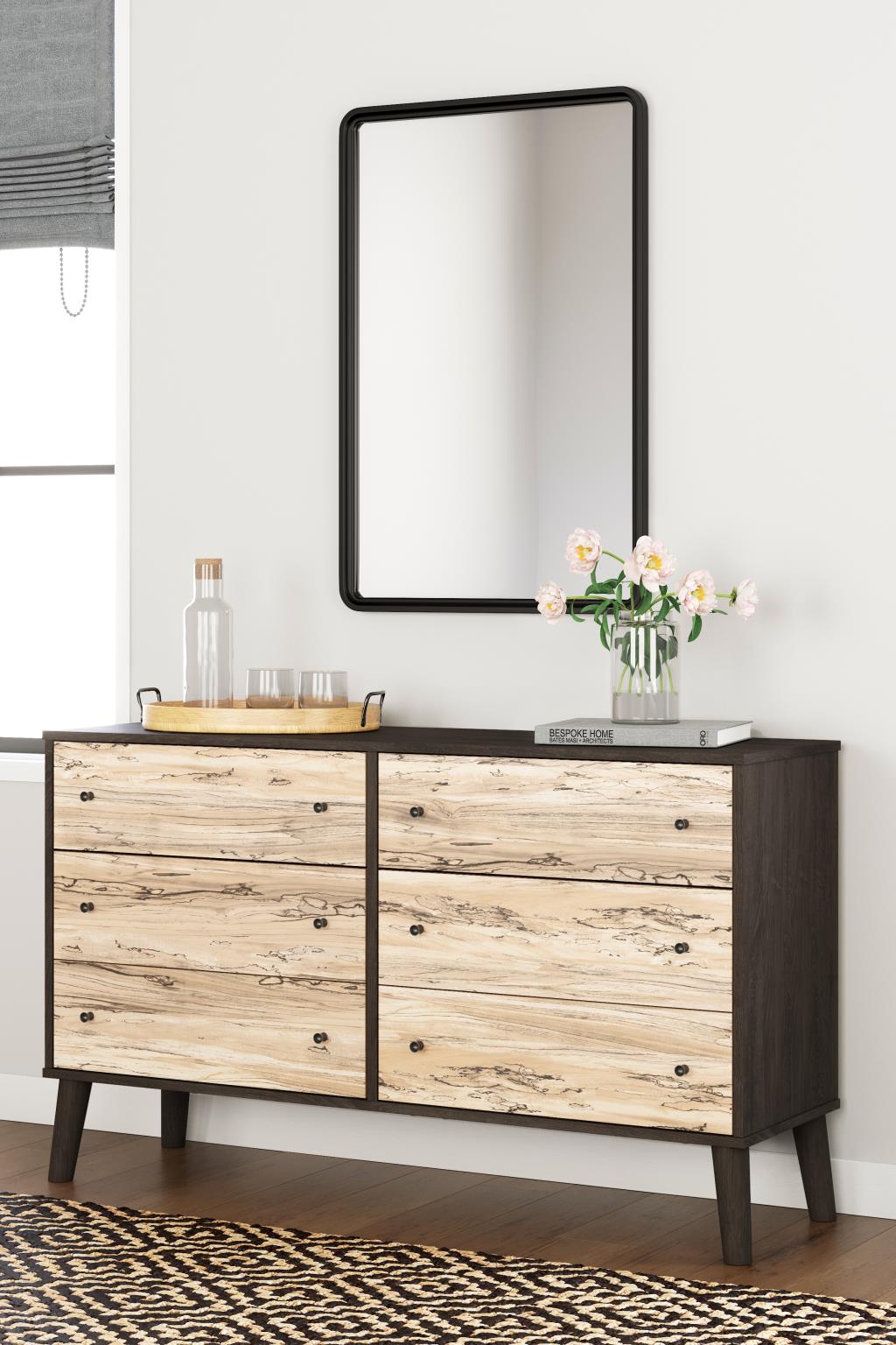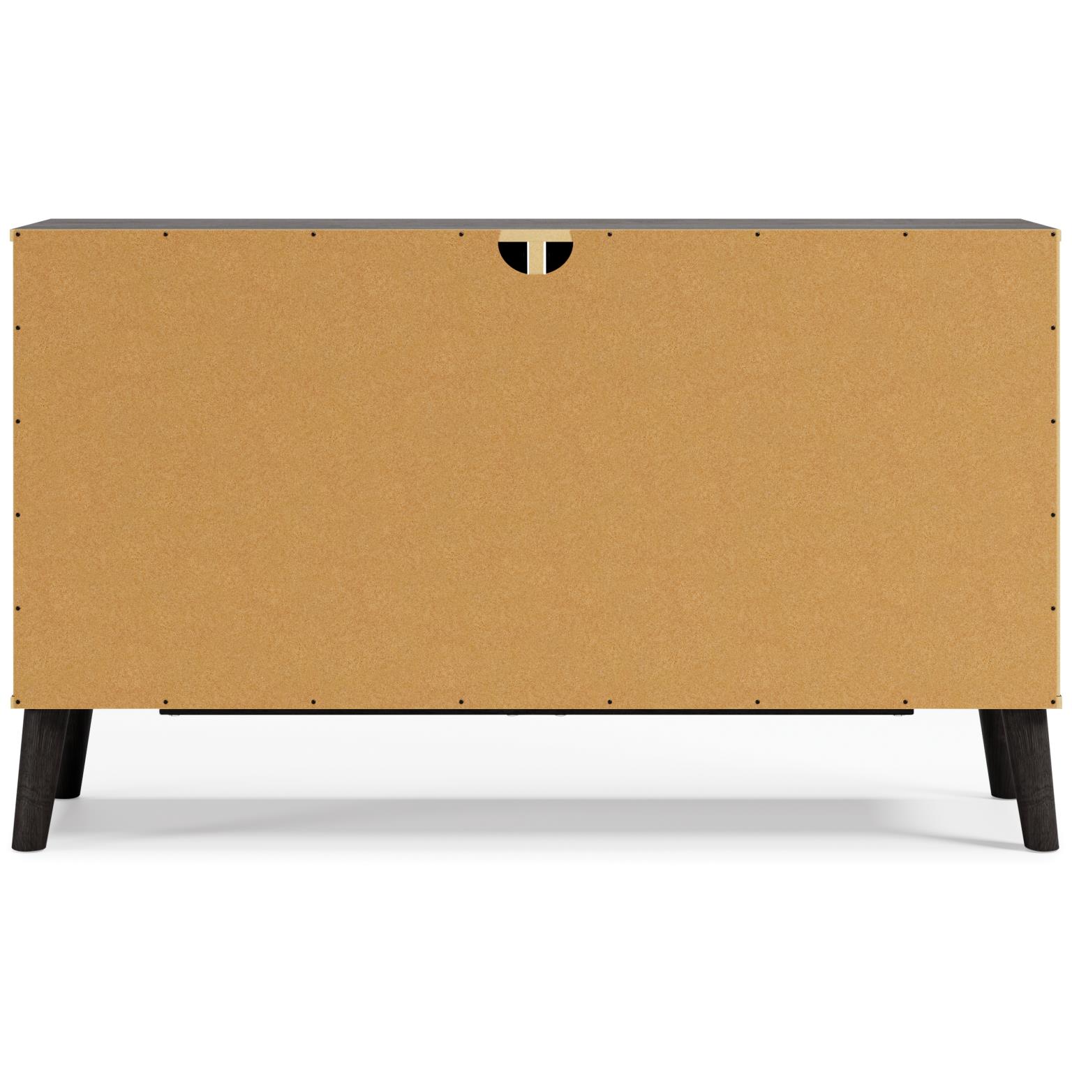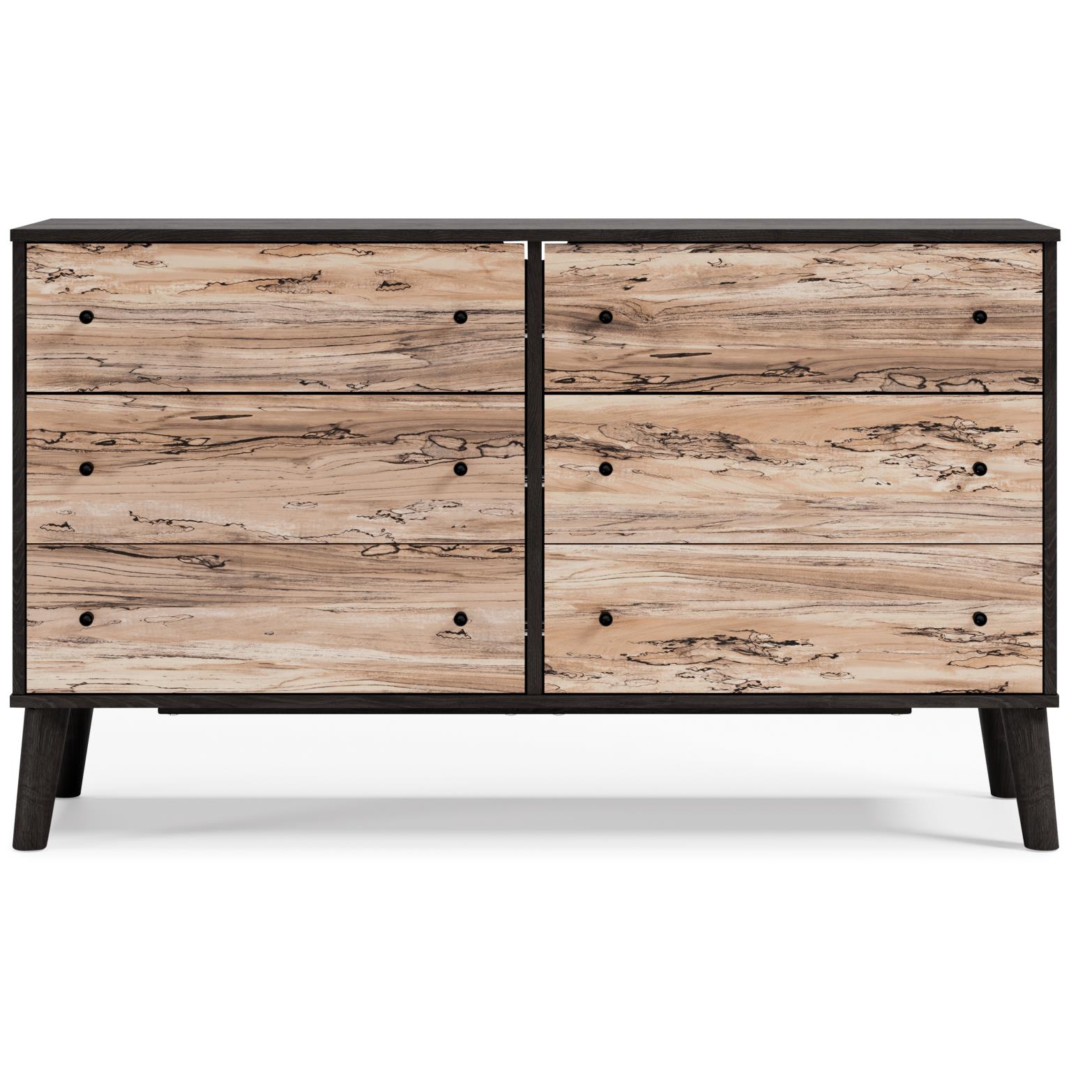 The perfect marriage of simple and contemporary style,,,, this dresser is a charming addition to your home. It features an expressive two-tone look,,,, with a dark charcoal finish over replicated oak grain with an authentic touch and a replicated sugarberry wood grain. Ball-bearing glides offer smooth opening and closing of the drawers,,,, while matte black knobs and splay legs add a finishing touch.