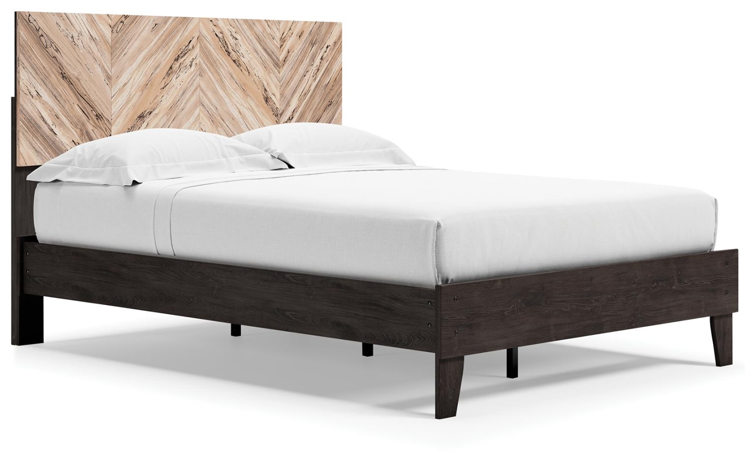 The perfect marriage of simple and contemporary style,,,, this full panel platform bed is a charming addition to your home. It features an expressive two-toned look,,,, with a dark charcoal finish over replicated oak grain with an authentic touch and a replicated sugarberry wood grain. Best of all,,,, this bed includes everything you need—no additional foundation or box spring required.