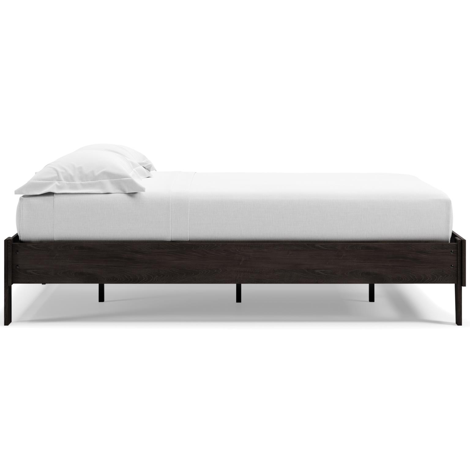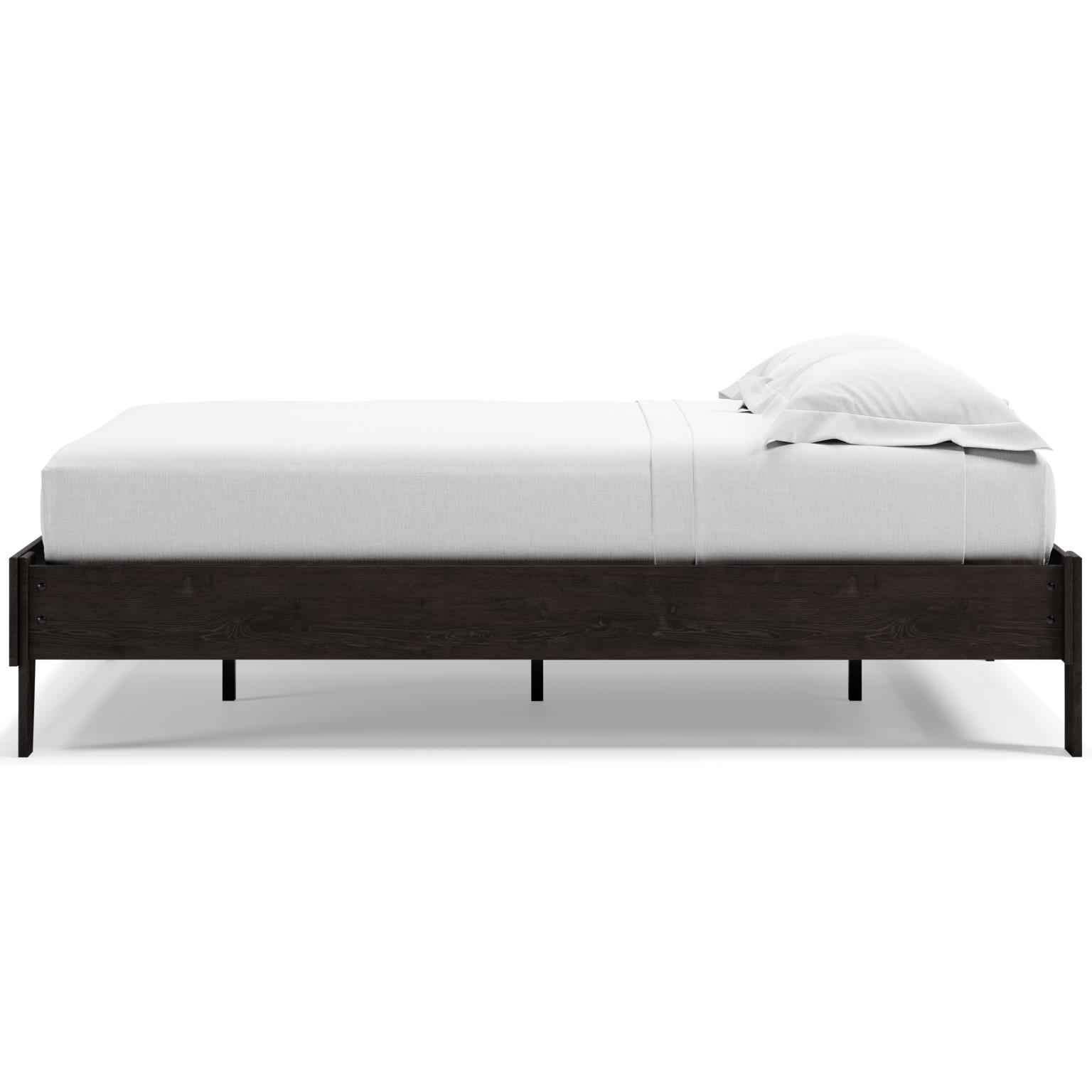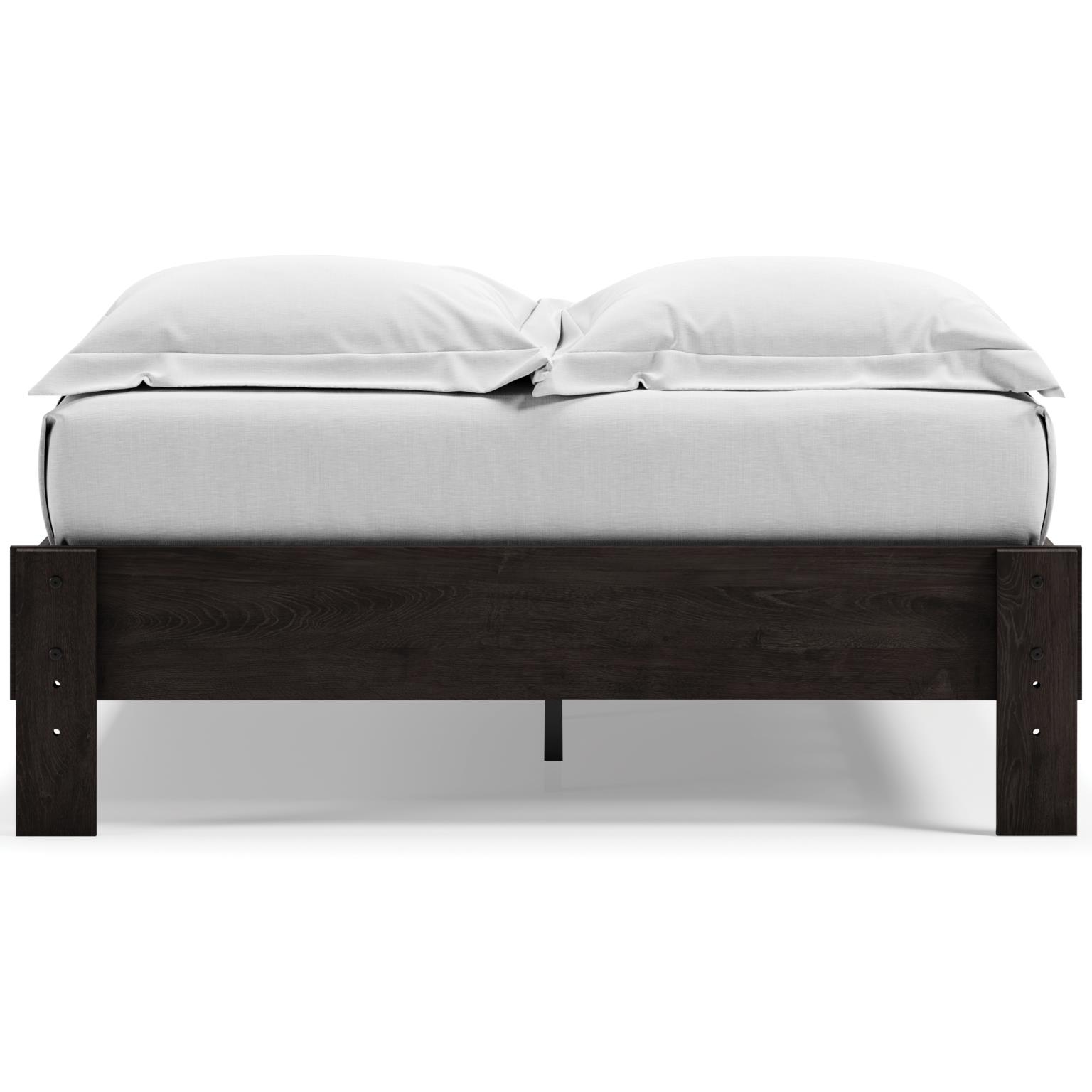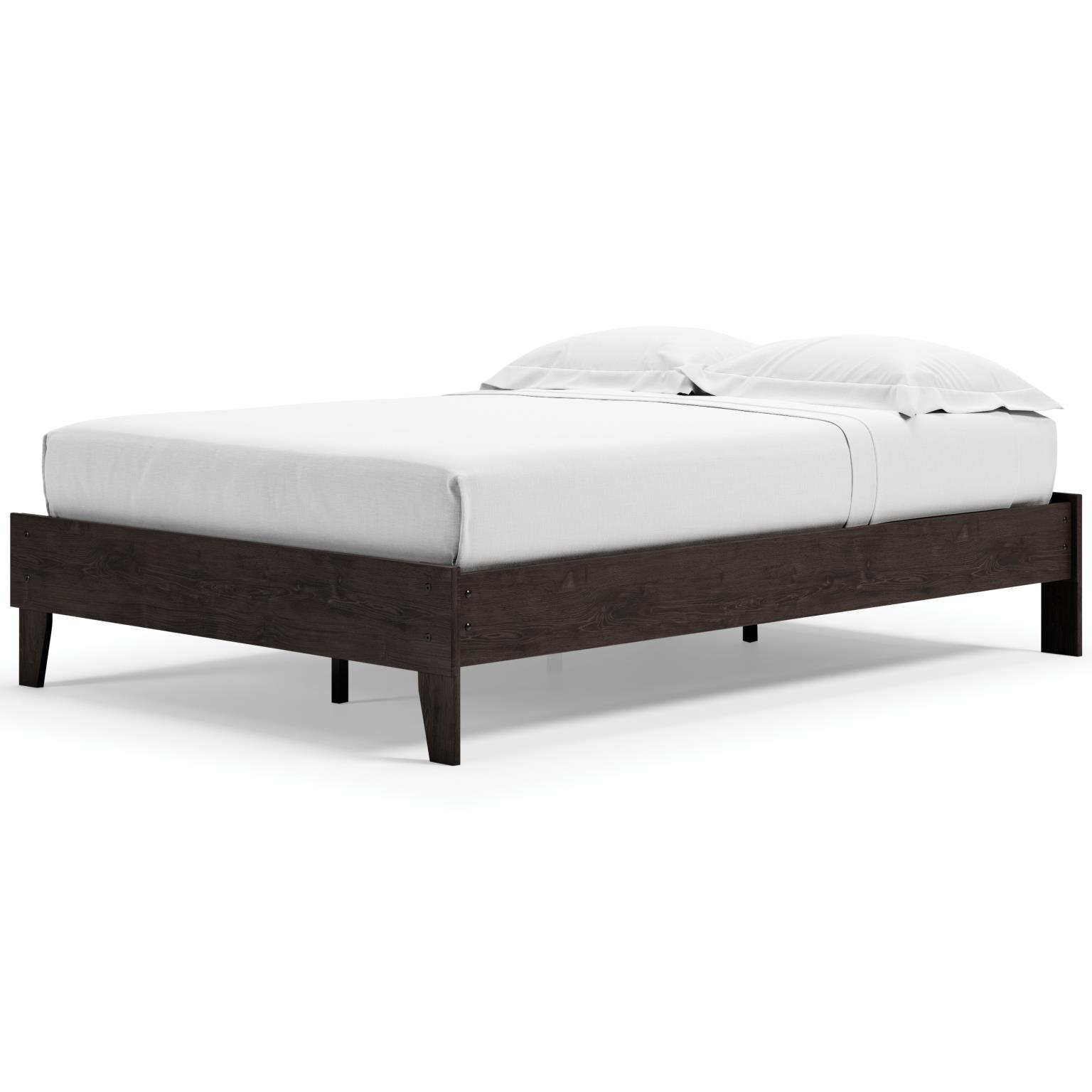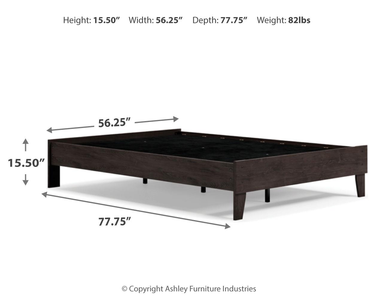 The perfect marriage of simple and contemporary style,,,, this full platform bed is a charming addition to your home. This bed keeps things simple with its dark charcoal finish over replicated oak grain. Best of all,,,, this bed includes a footboard,,,, rails and platform–no additional foundation or box spring needed.