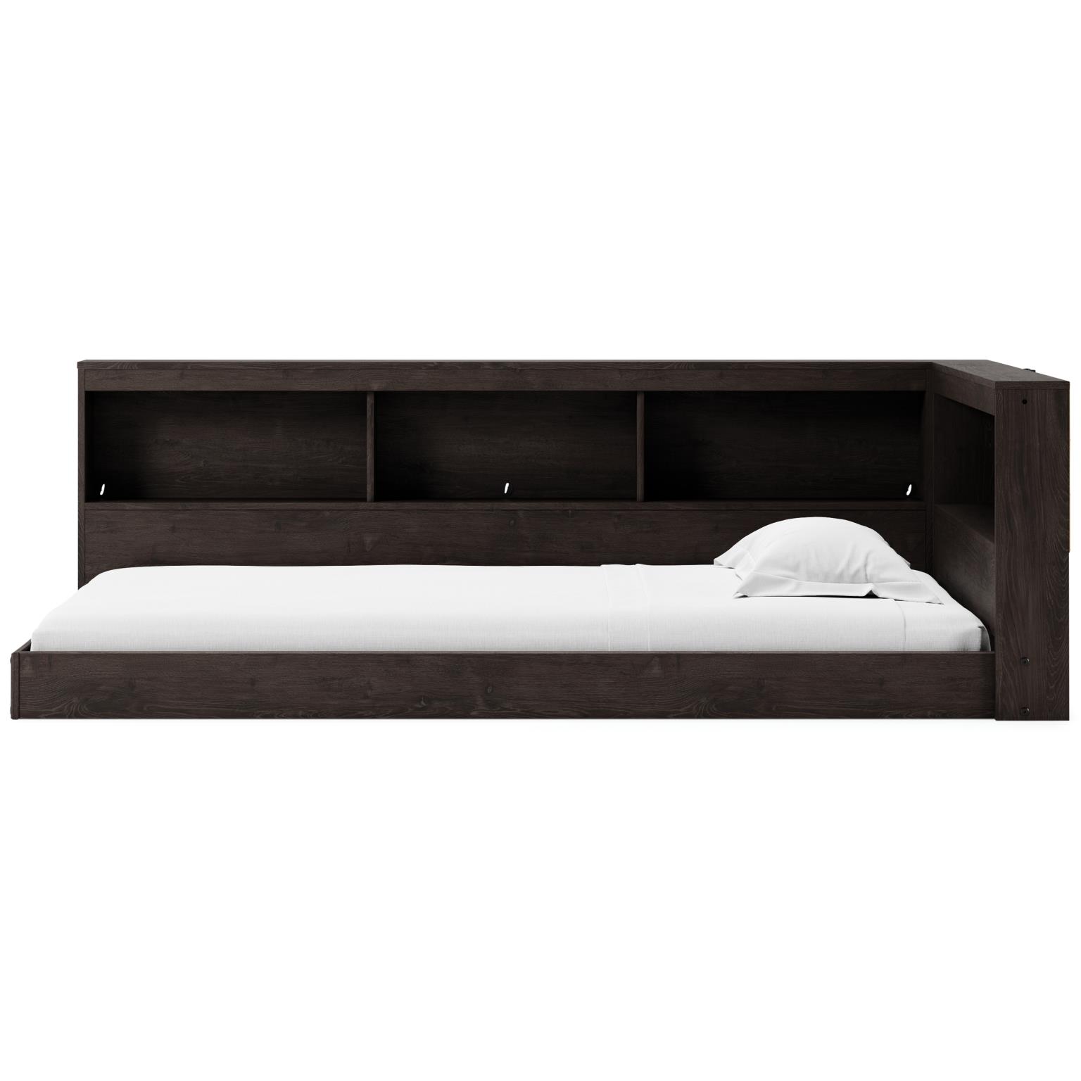 This twin bookcase storage bed is an inspired find,,,, beautifully blending simple and contemporary style. Its dark charcoal finish over replicated oak grain with an authentic touch keeps things simple,,,, while the bookshelf storage creates added function. This charming storage bed also offers slim-profile dual USB chargers and requires no additional foundation.