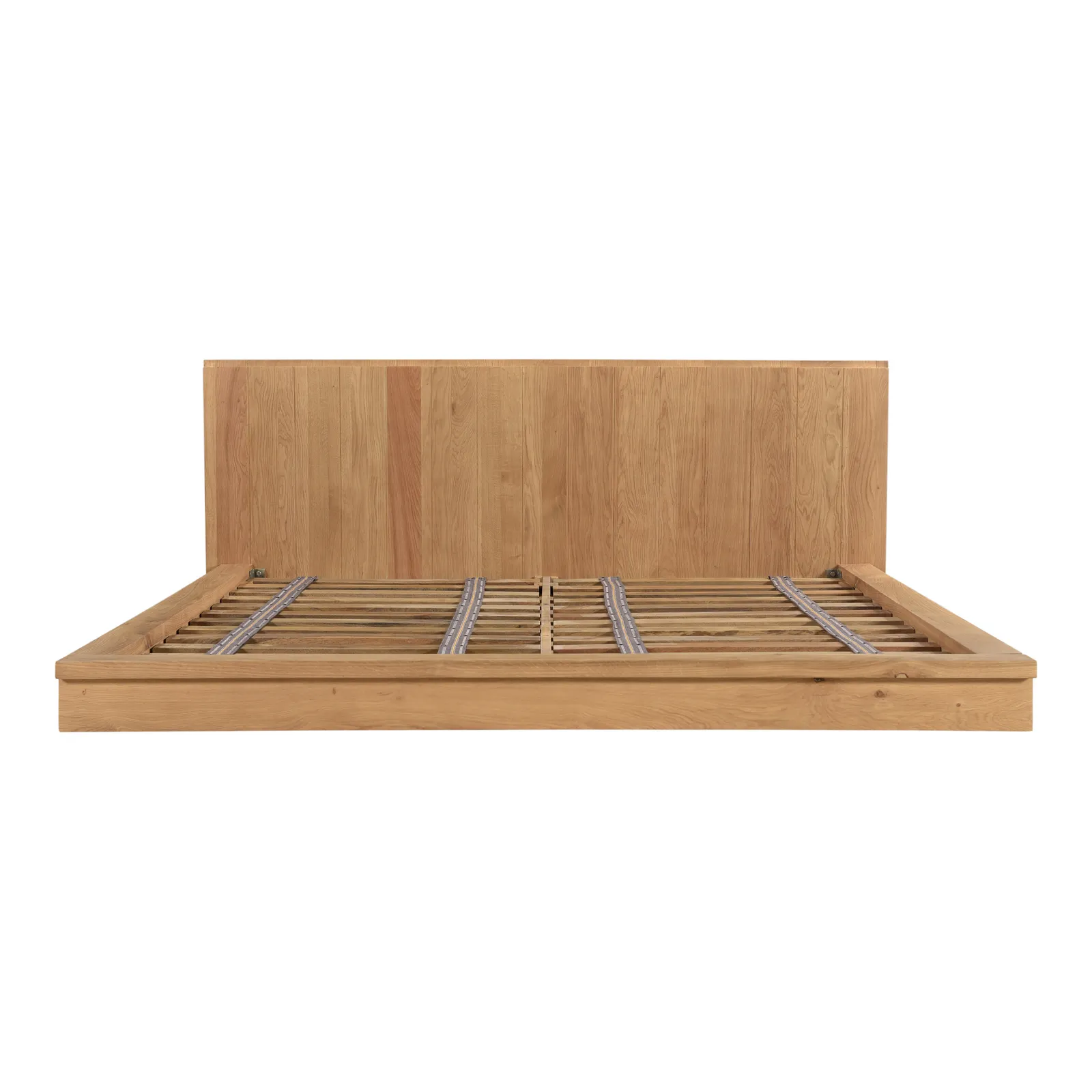 - A king bed with solid oak construction. A low-profile build features an expansive headboard