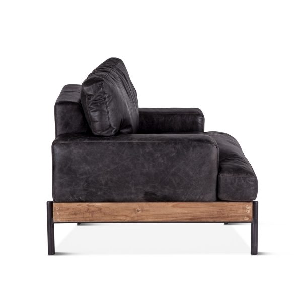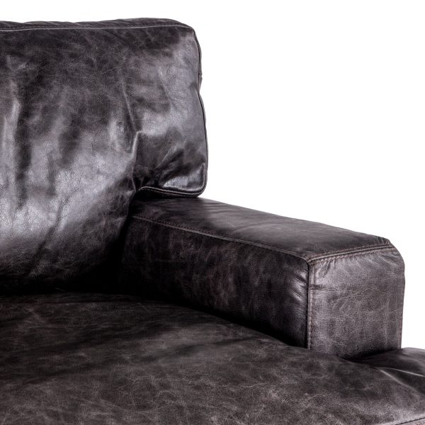 Our Portofino collection of retro-inspired chairs and sofas will add vintage charm to your dining room, kitchen, or living room. The distressed antique ebony leather seat of the armchair has a soft, luxurious feel, and the high density foam cushion and heavy gauge sinuous spring, all combine to provide ultimate comfort. The four iron legs in matte finish feature caps to protect all types of flooring, while the oak panel base provides a vintage flair. Perfect for placing in a formal living space or adorning your favorite reading nook, this beautiful and unique armchair will harmonize with any style of decor from industrial to contemporary. This pre-assembled armchair is ready-to-use and of the finest quality, and with its classic design and elegance, it will make an effortless addition to any home.