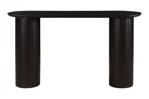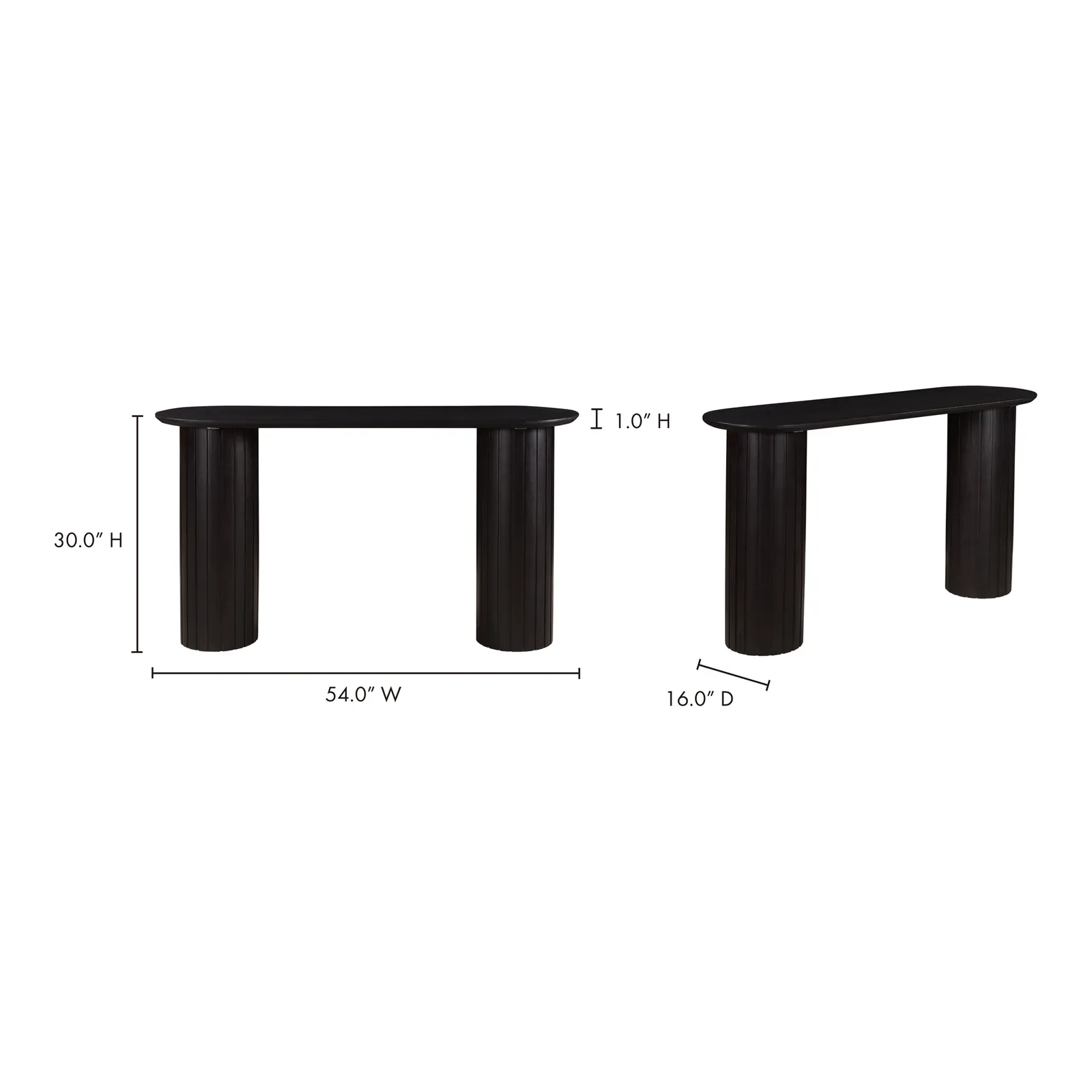 A convergence of shape and form, the Povera console table will serve as the pillar of your entryway or living area. Povera features two large columns supporting an expansive tabletop, their gentle ribbing reminiscent of ripples and waves. With a rich black finish featuring a soft purple undertone that allows the natural wood grain of the Acacia wood to show through, this console table uses simple geometry and natural materials to form an enchanting experience. Offering bold statement appeal, Povera incorporates the elegance of ratio into your home.