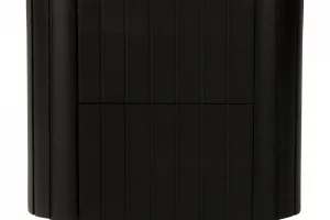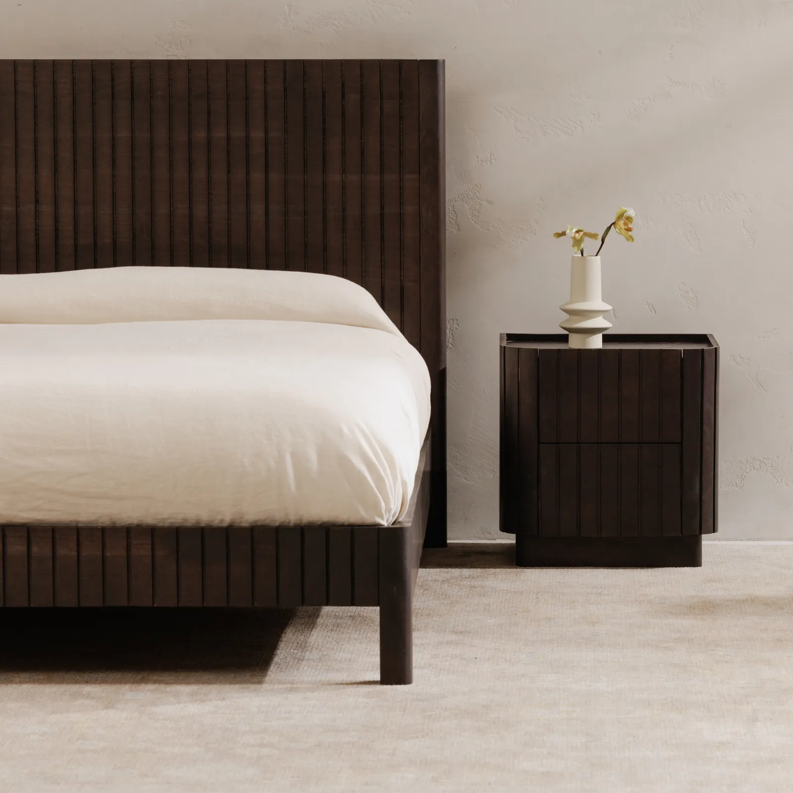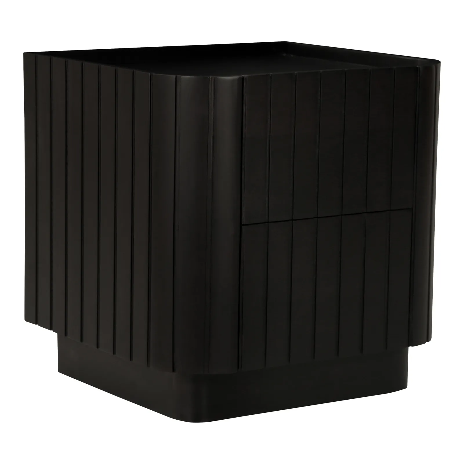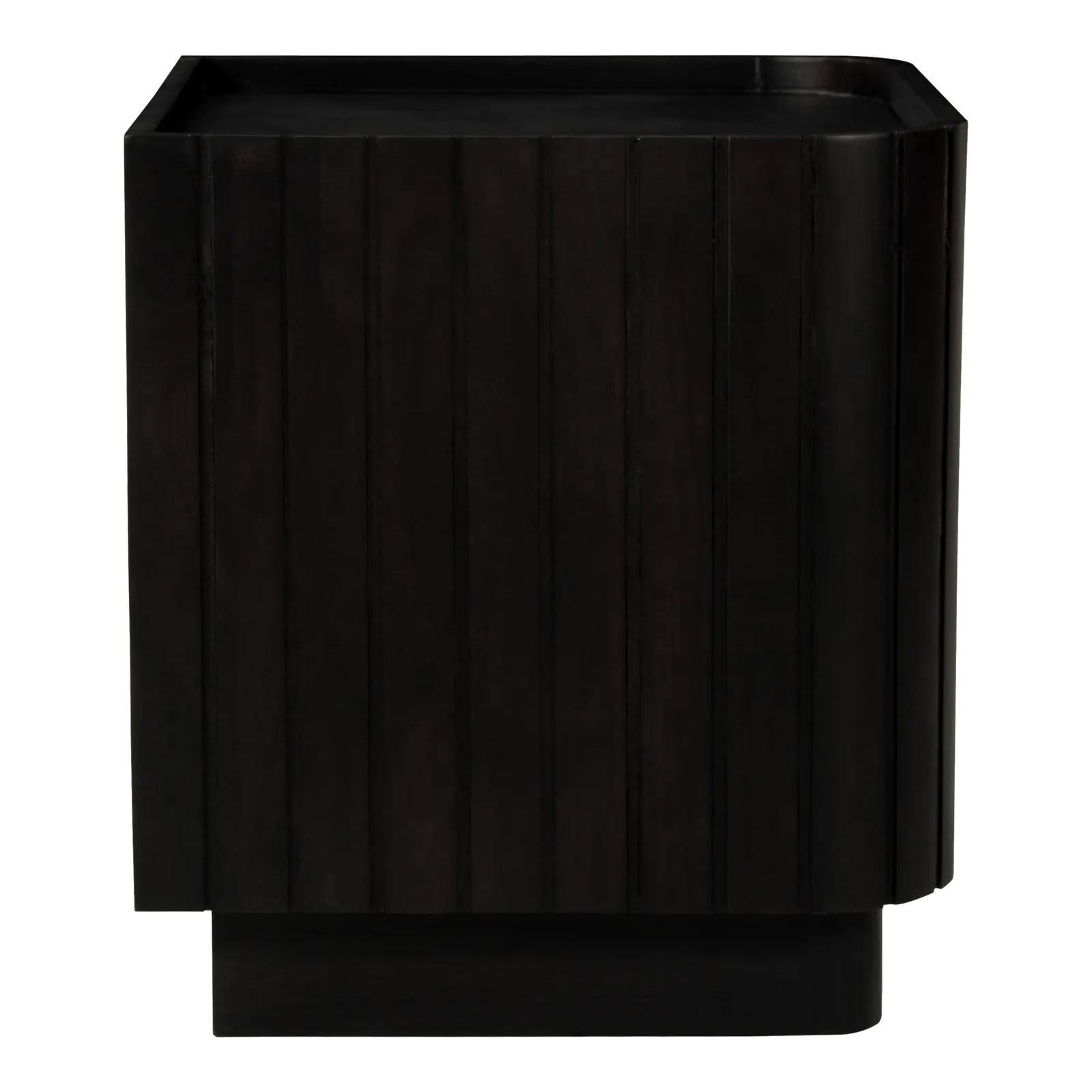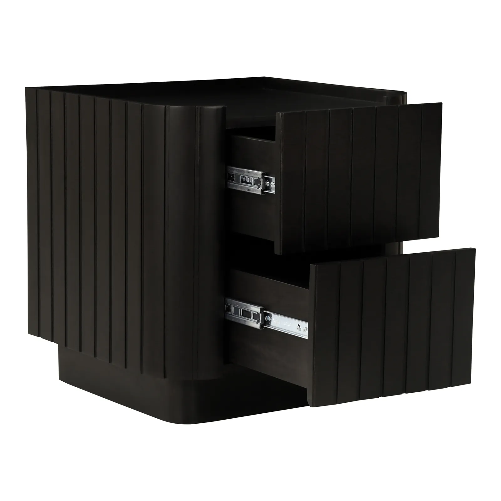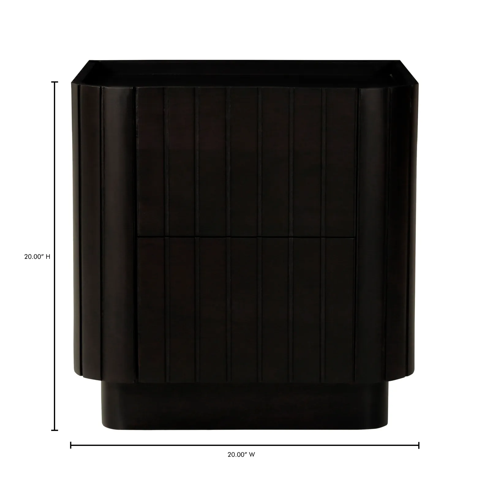 The Povera nightstand balances detail and form offering bold statement appeal and ample storage. This piece anchors the bedroom with its Acacia façade’s gentle ribbing reminiscent of ripples and waves adding texture and warmth. A rich black finish with a soft purple undertone allows the natural wood grain to show through. Naturally beautiful with an impactful silhouette, two soft close drawers open with side mount ball bearing glides.