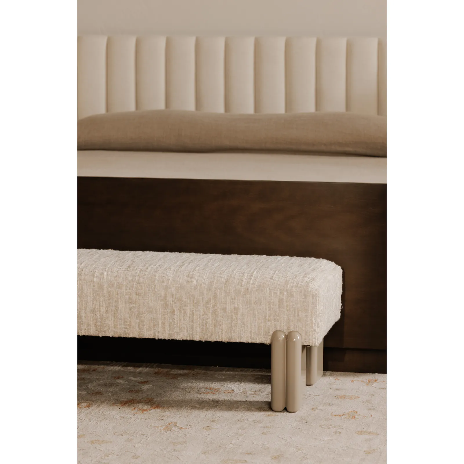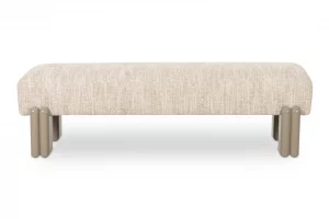The Priya bench combines modernity and comfort with its high-gloss iron legs and contrasting textured fabric, while the double-leg column detail adds a unique touch of visual intrigue. At 56 inches wide, this bench works in entryways or bedrooms with its textured boucle yarn finish upholstery and high-density foam seat offering maximum comfort.