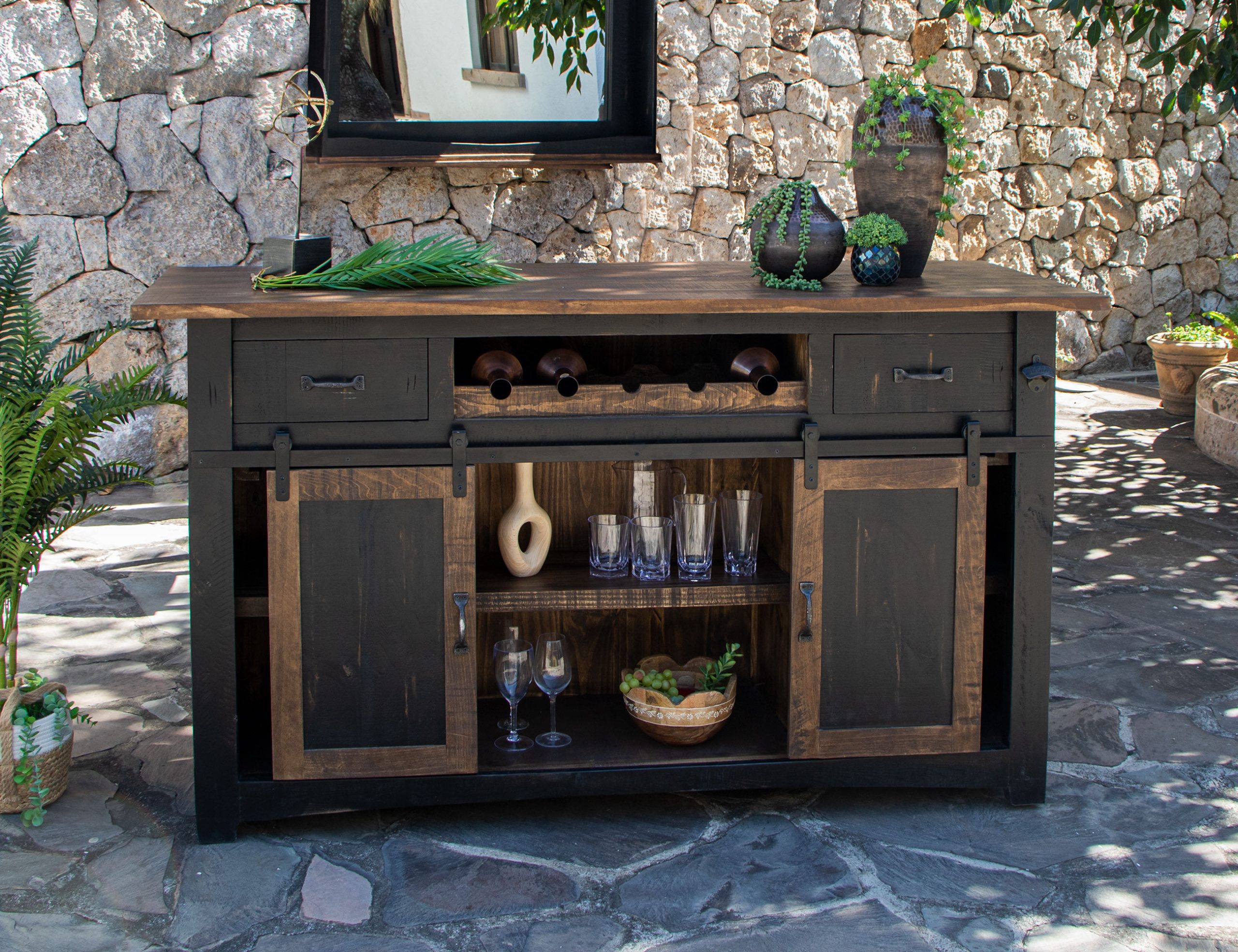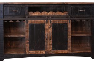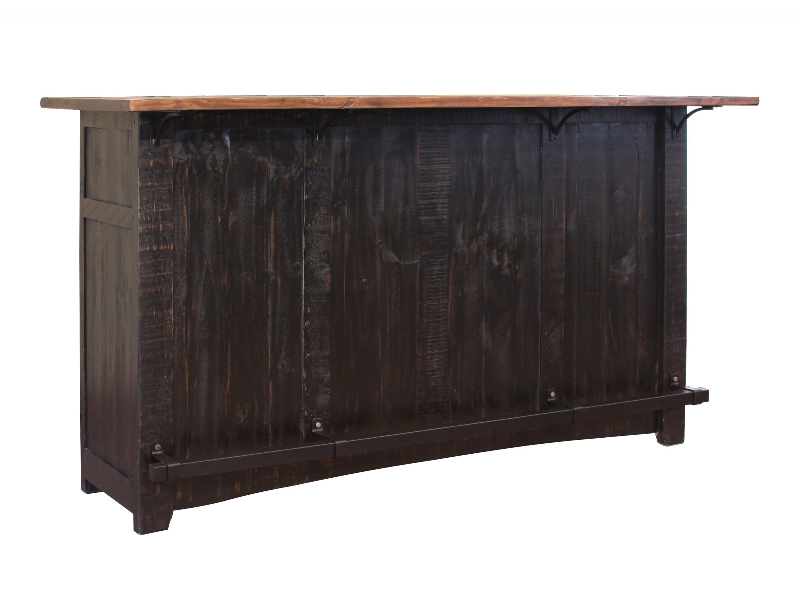 • Multi-step deep brown finish applied to distressed wood, complemented by a matte black finish on the iron base.