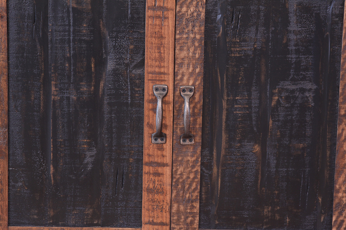 • Two-tone, multi-step lacquer finish with a weathered black effect on hand-distressed wood and brown tops.