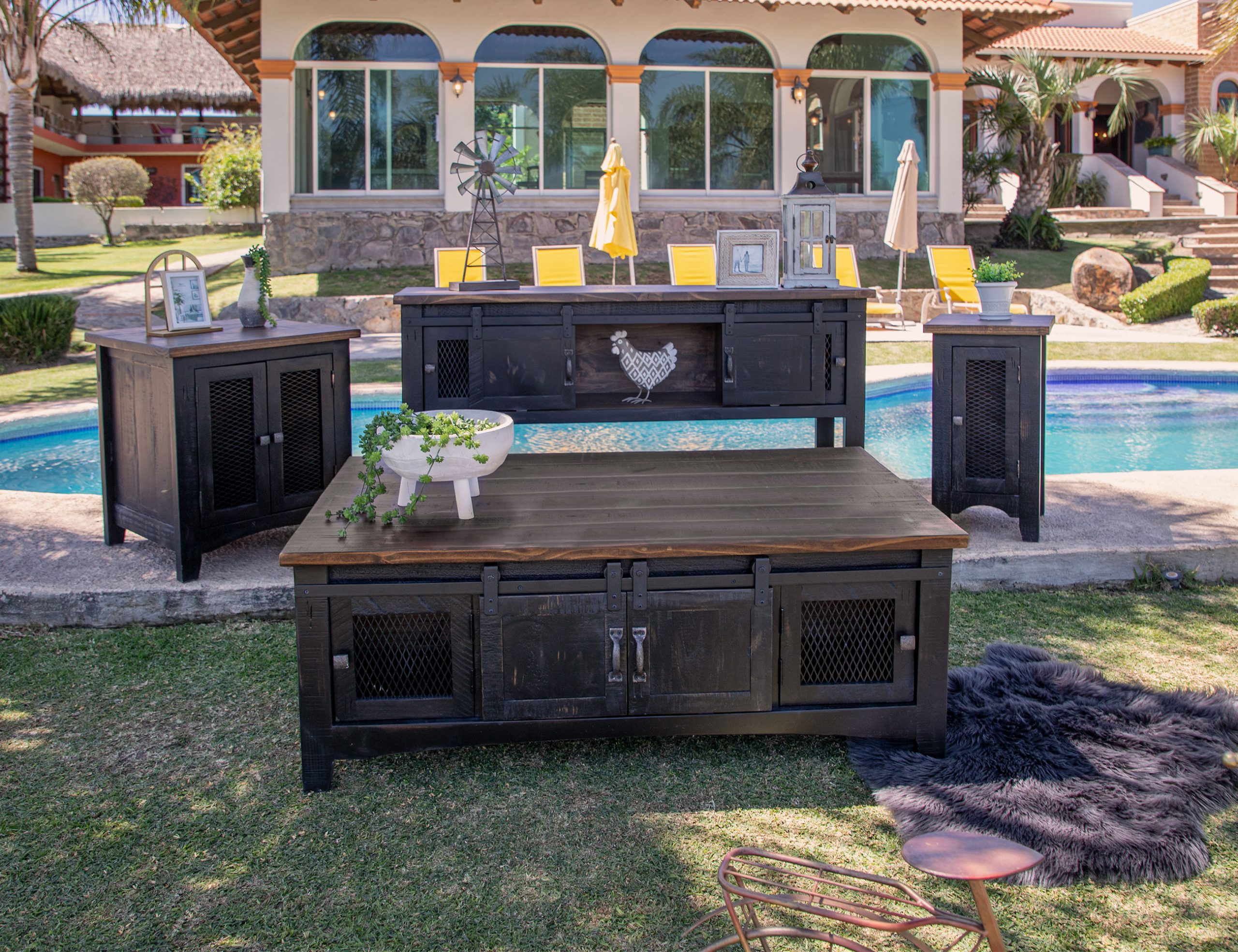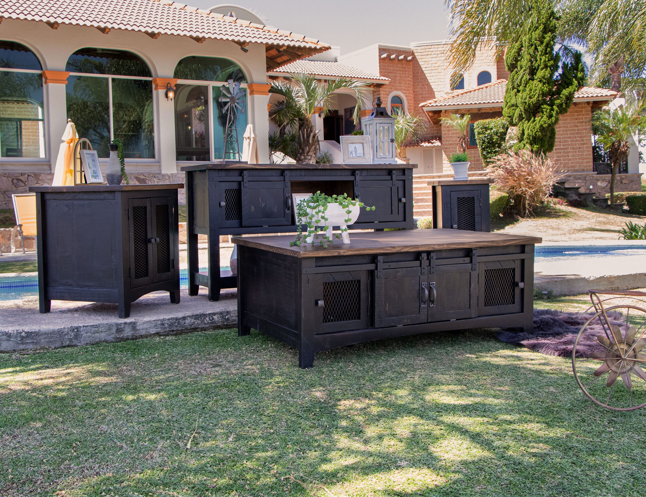• Introducing our Pueblo Black collection, crafted from solid pine wood. This rustic collection is the perfect addition to bring your dream space to life. It features a hand-distressed finish in black and brown on the tops.