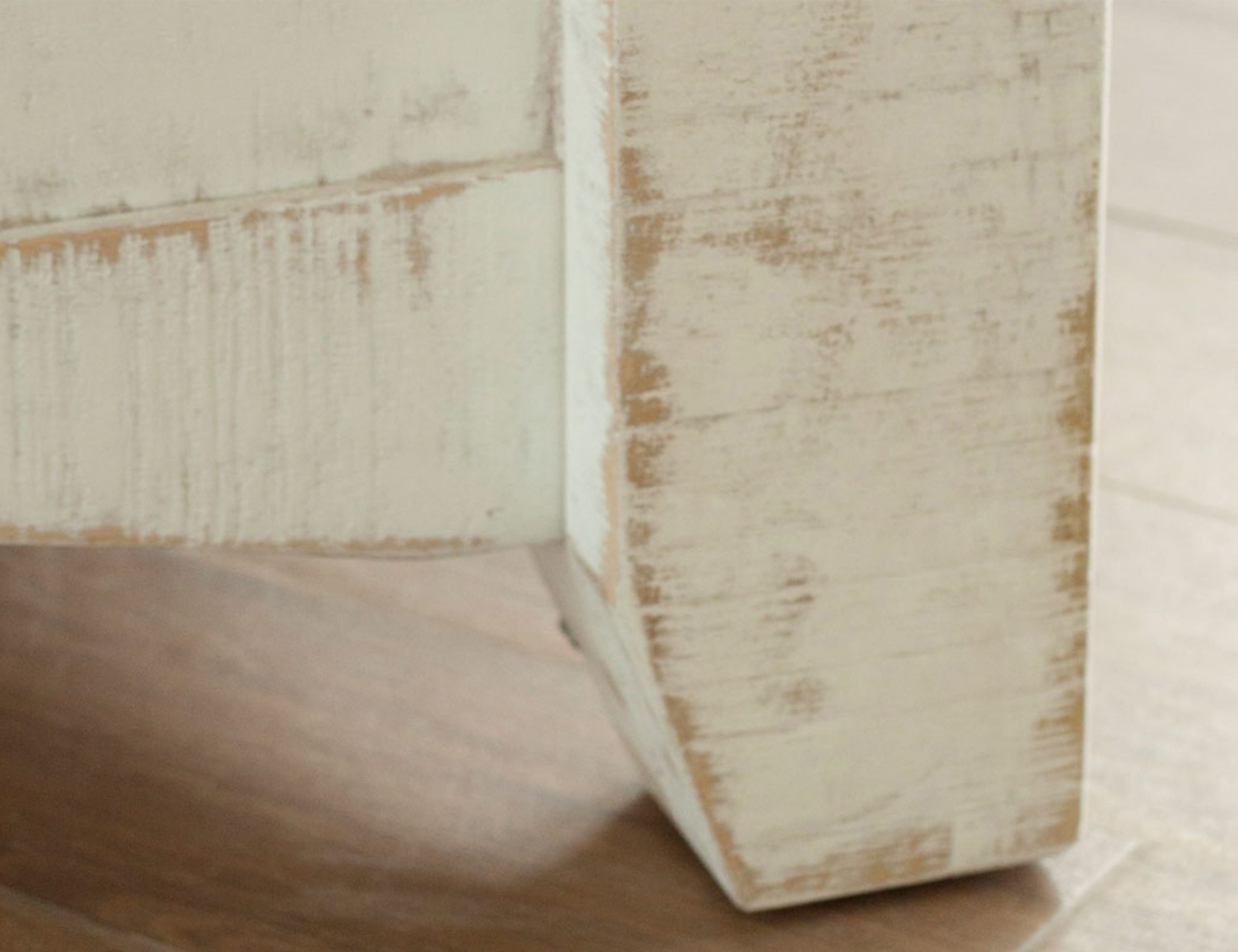 • Two-tone, multi-step lacquer finish with a weathered white effect on hand-distressed wood and brown tops.