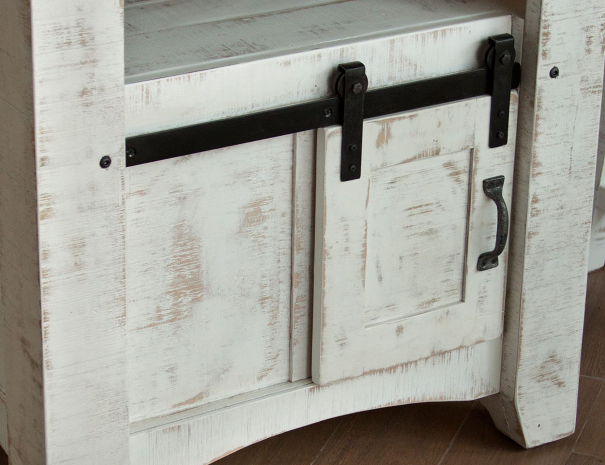 • Two sliding barn-style doors offer convenience and rustic appeal.
