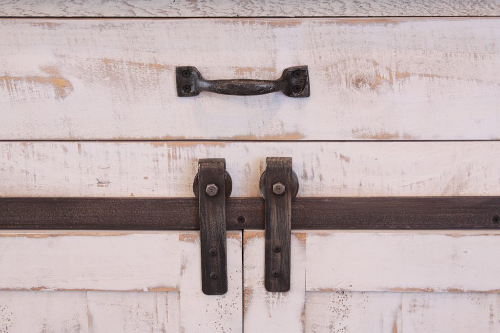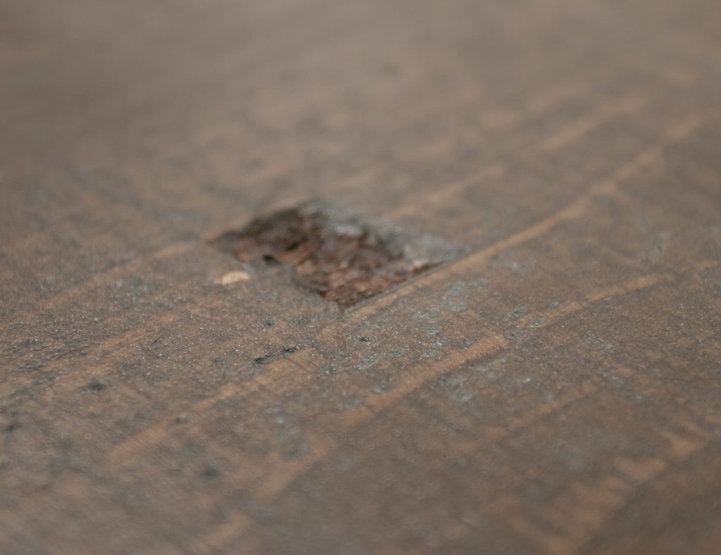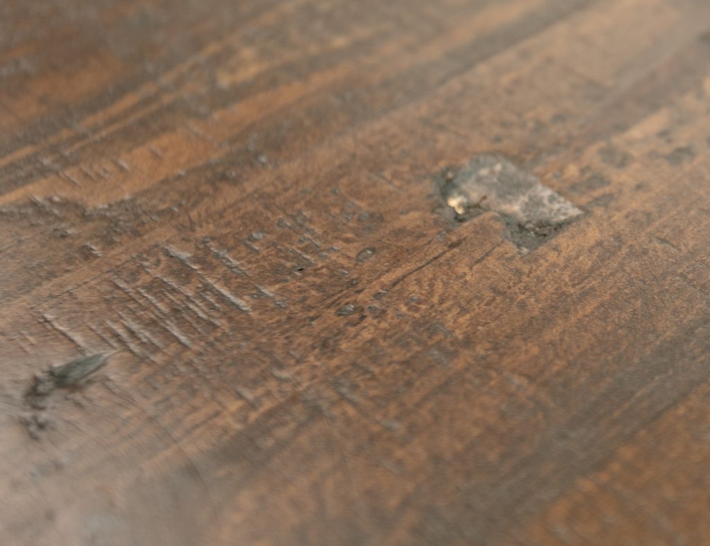 • Multi-step lacquer in brown finish on hand-distressed wood.