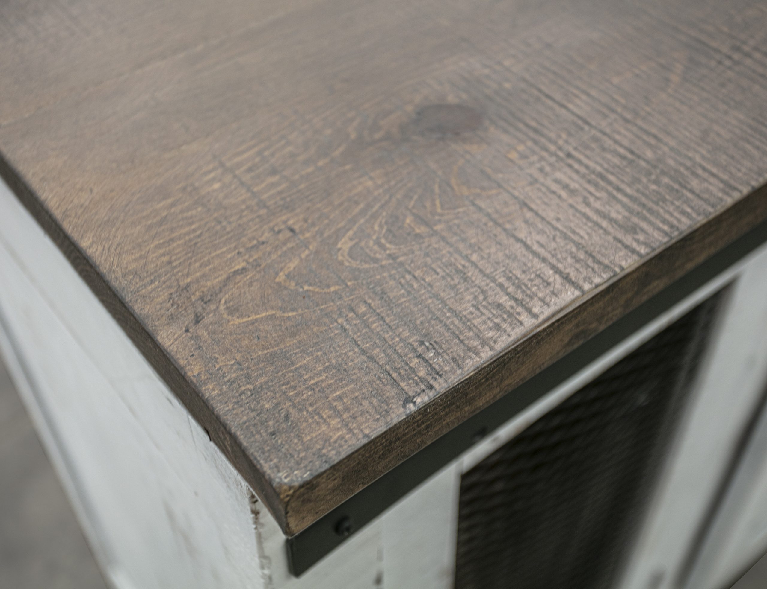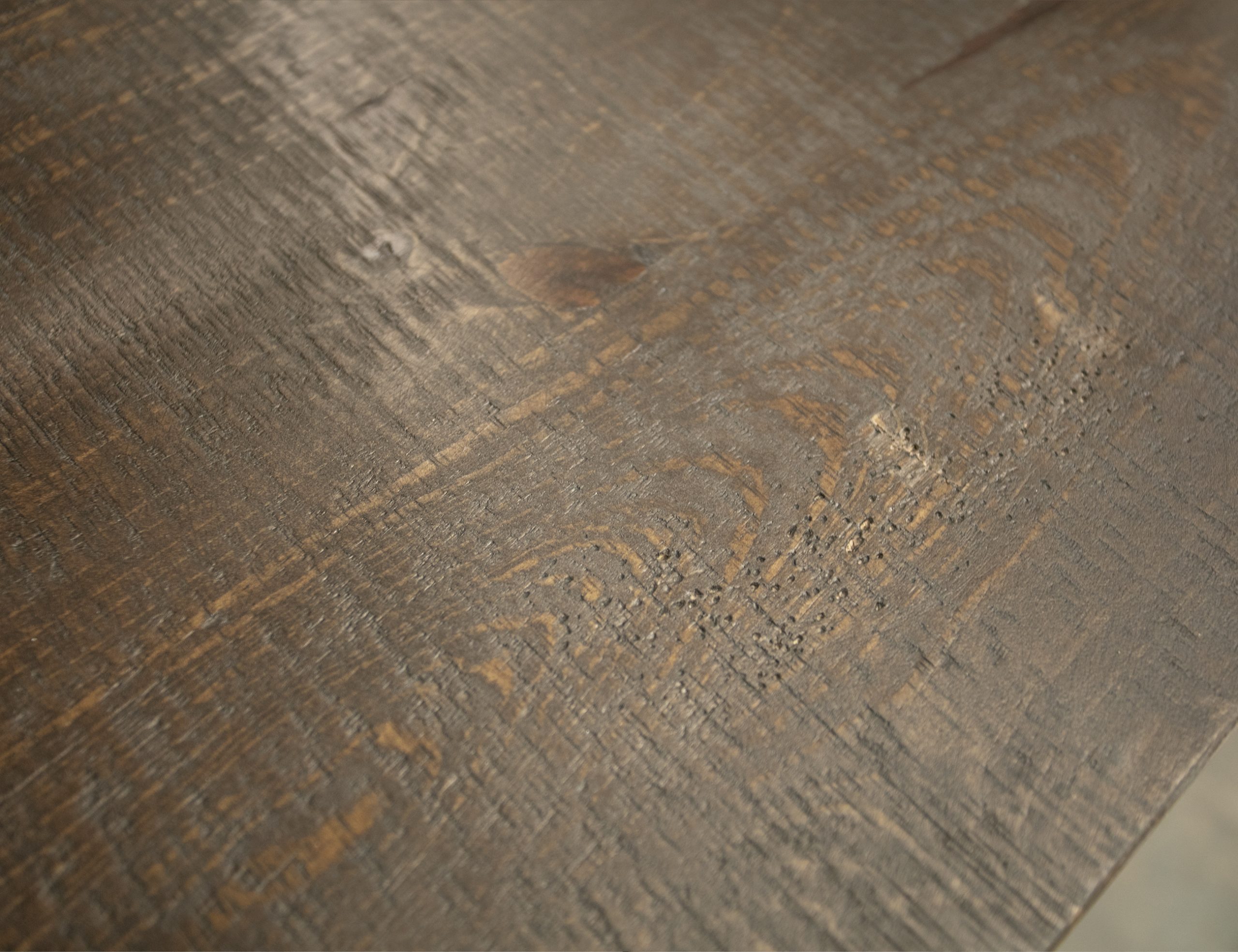 • Multi-step lacquer in brown finish on hand-distressed wood.