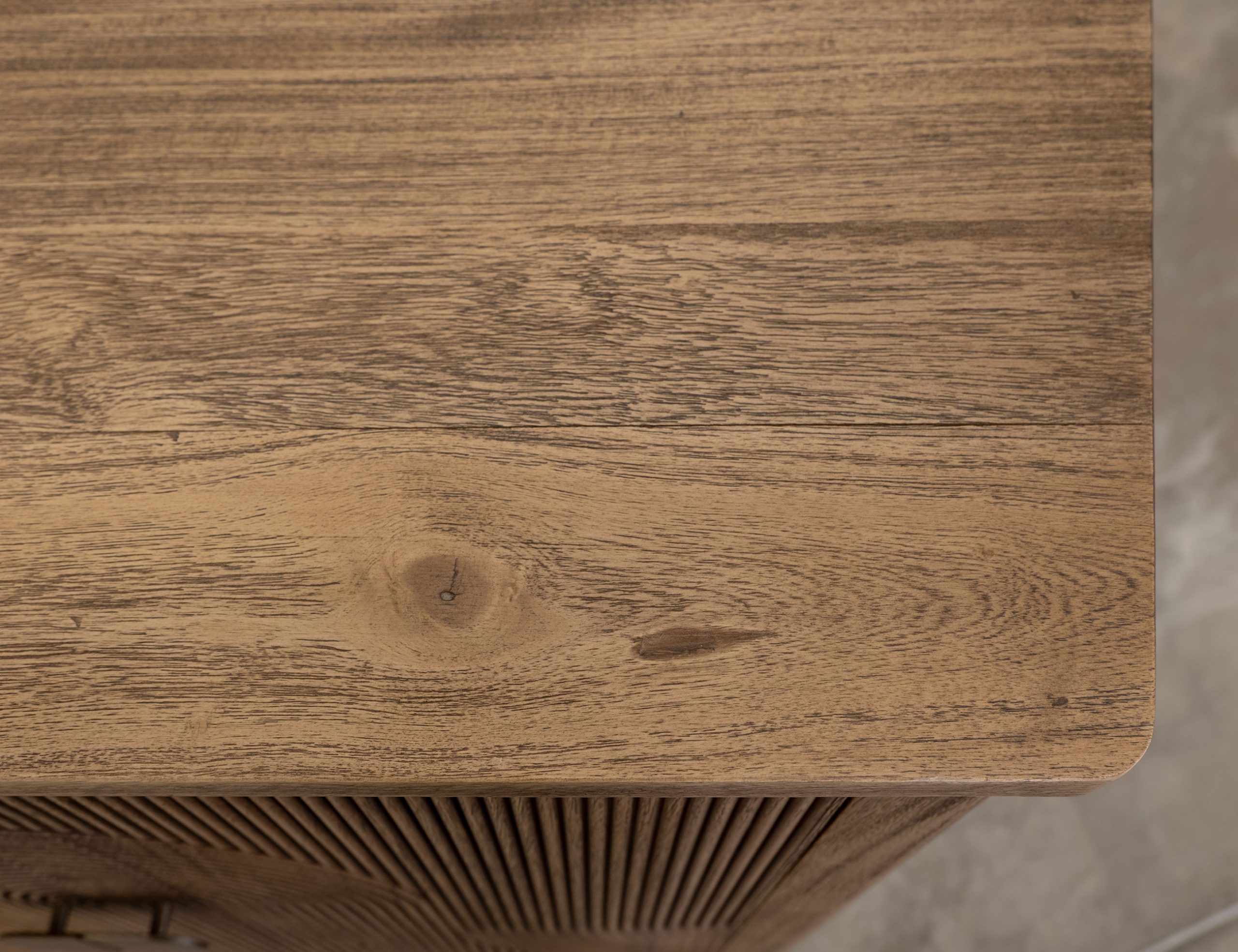 • Two-tone, multi-step lacquer finish with a weathered white effect on hand-distressed wood and brown tops.