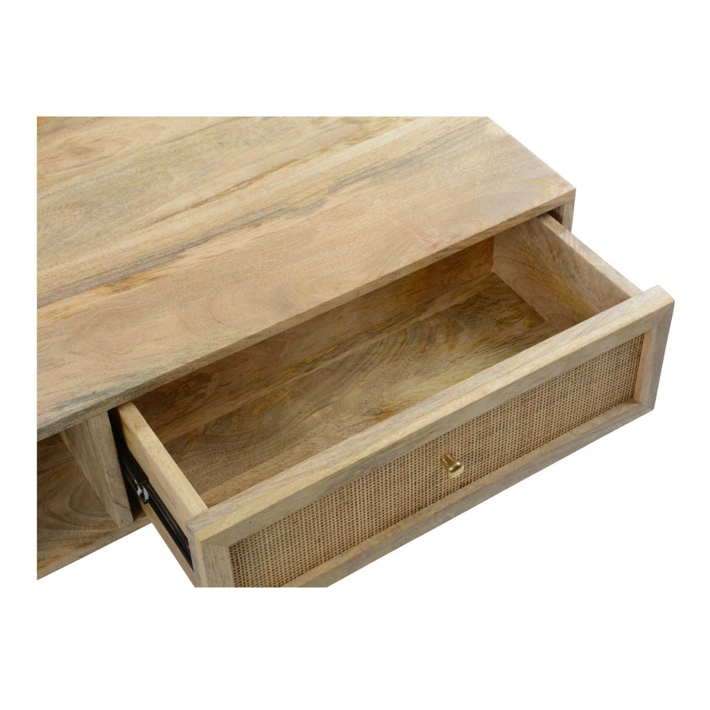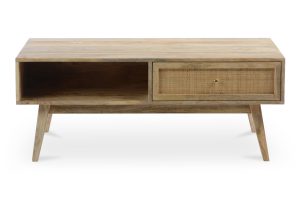 The Reed coffee table is the perfect accent piece. Natural wood grain, whorls, and knots lend it a bohemian or rustic look in your home. Its single sliding reed drawer features a golden knob for a modern touch.