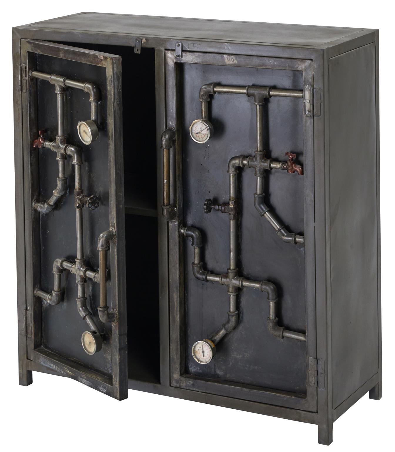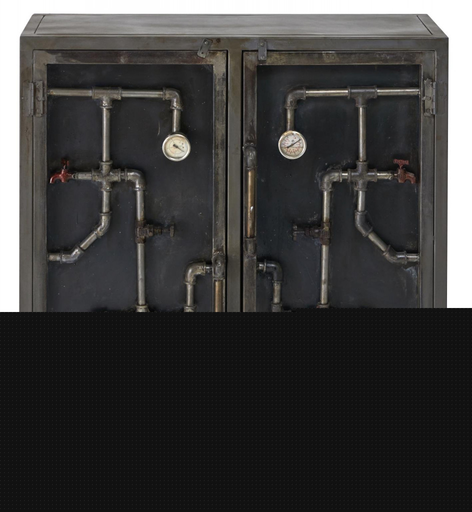 The Reimann group is constructed,, using MIG welding joint methods,, of iron in an antique black finish. This cabinet boasts a decorative array of re-purposed piping and other plumbing related items in the door front tableaux,, lever door stops and an ample shelved interior.