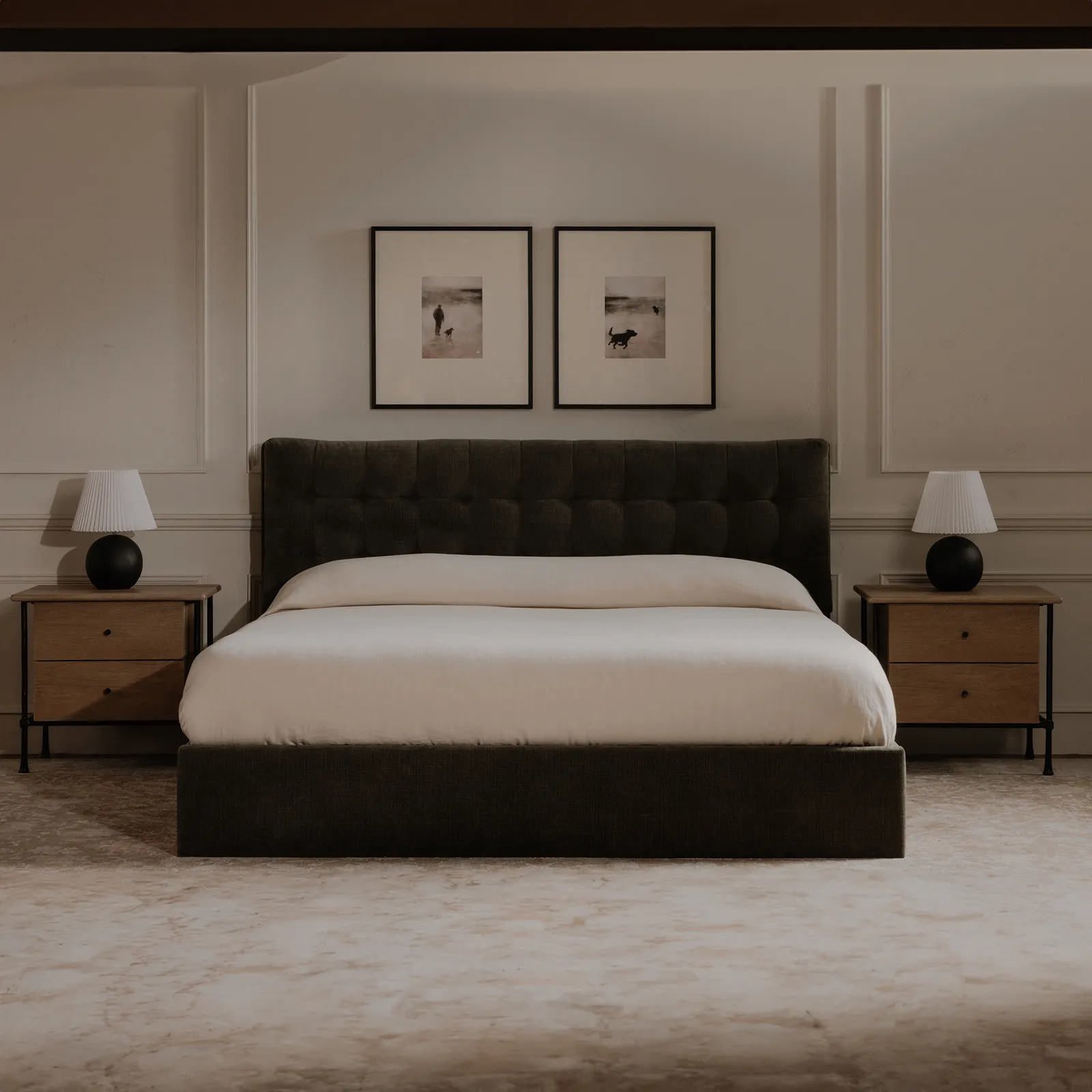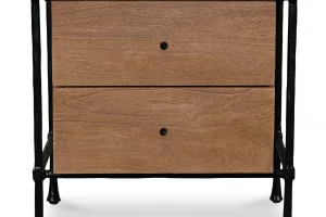 The Rene nightstand harmoniously blends traditional charm with contemporary elegance through its beveled feet and mixed material construction. Crafted from solid Acacia wood, its wire-brushed finish reveals intricate grain patterns resting atop hammered iron legs, creating a floating effect. Meticulous craftsmanship shines through wood joinery details and contrasting iron handles.