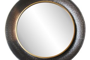 The Rey is a sleek round wall mirror with a grey metal frame and a thin band of gold, perfect as an entry way piece.