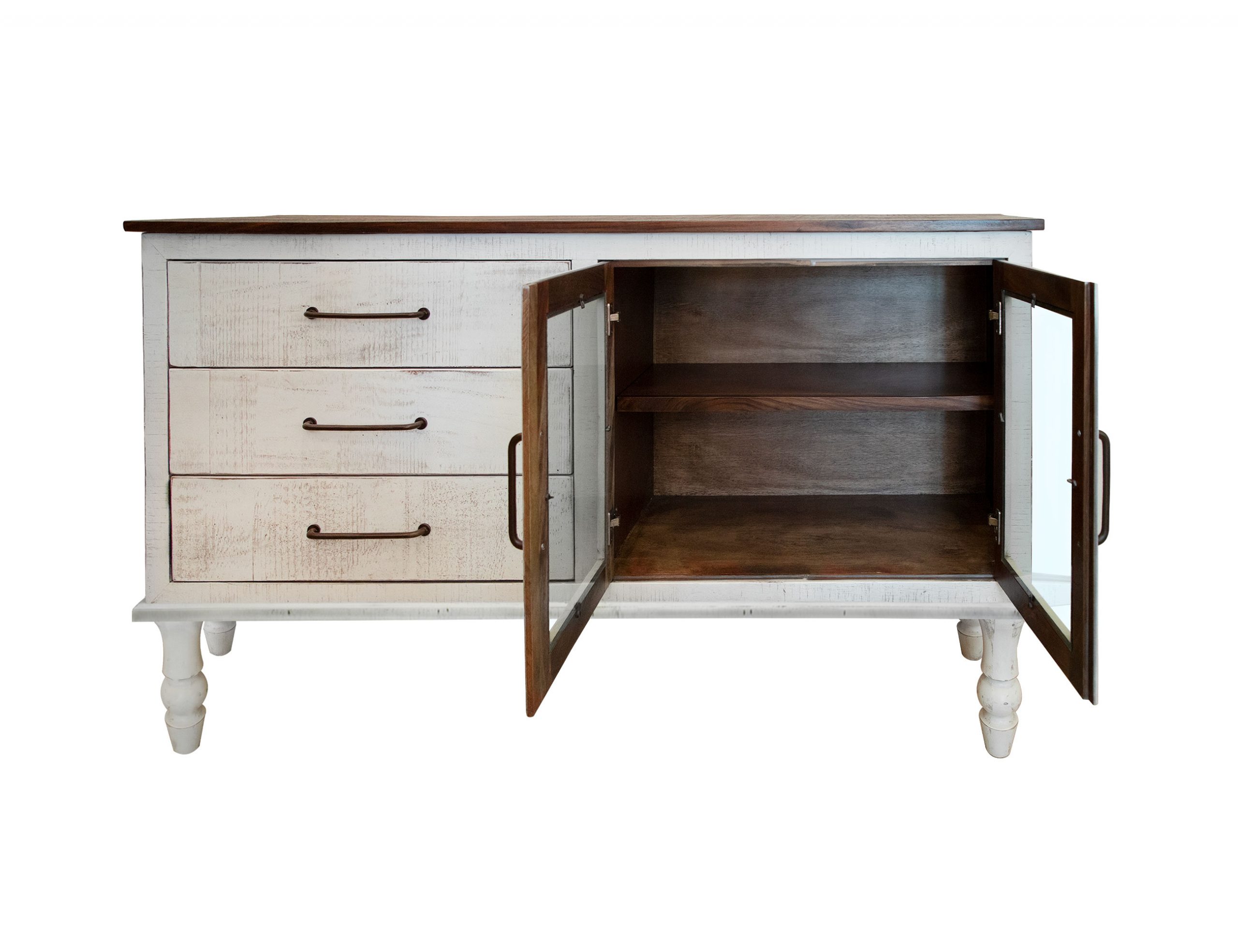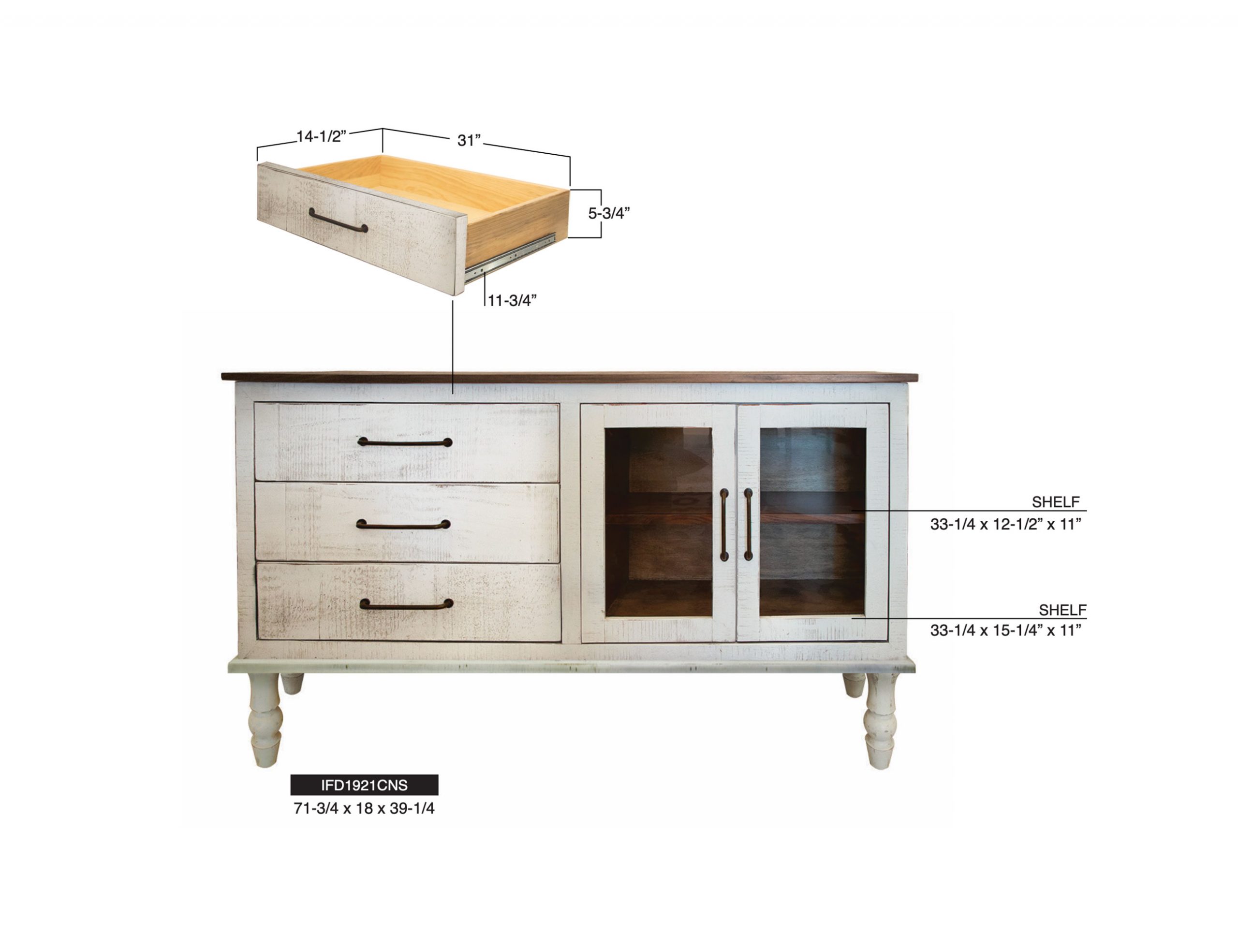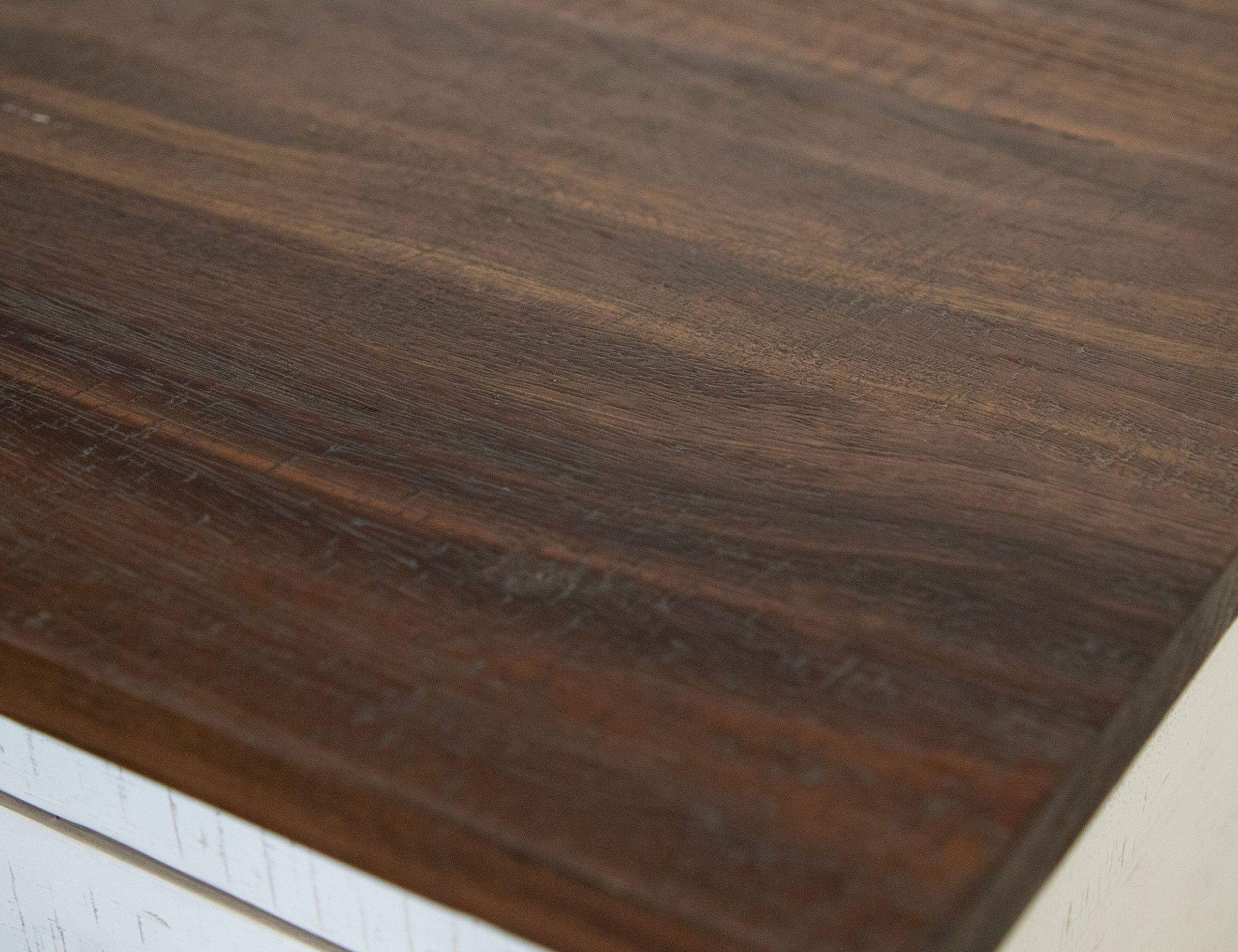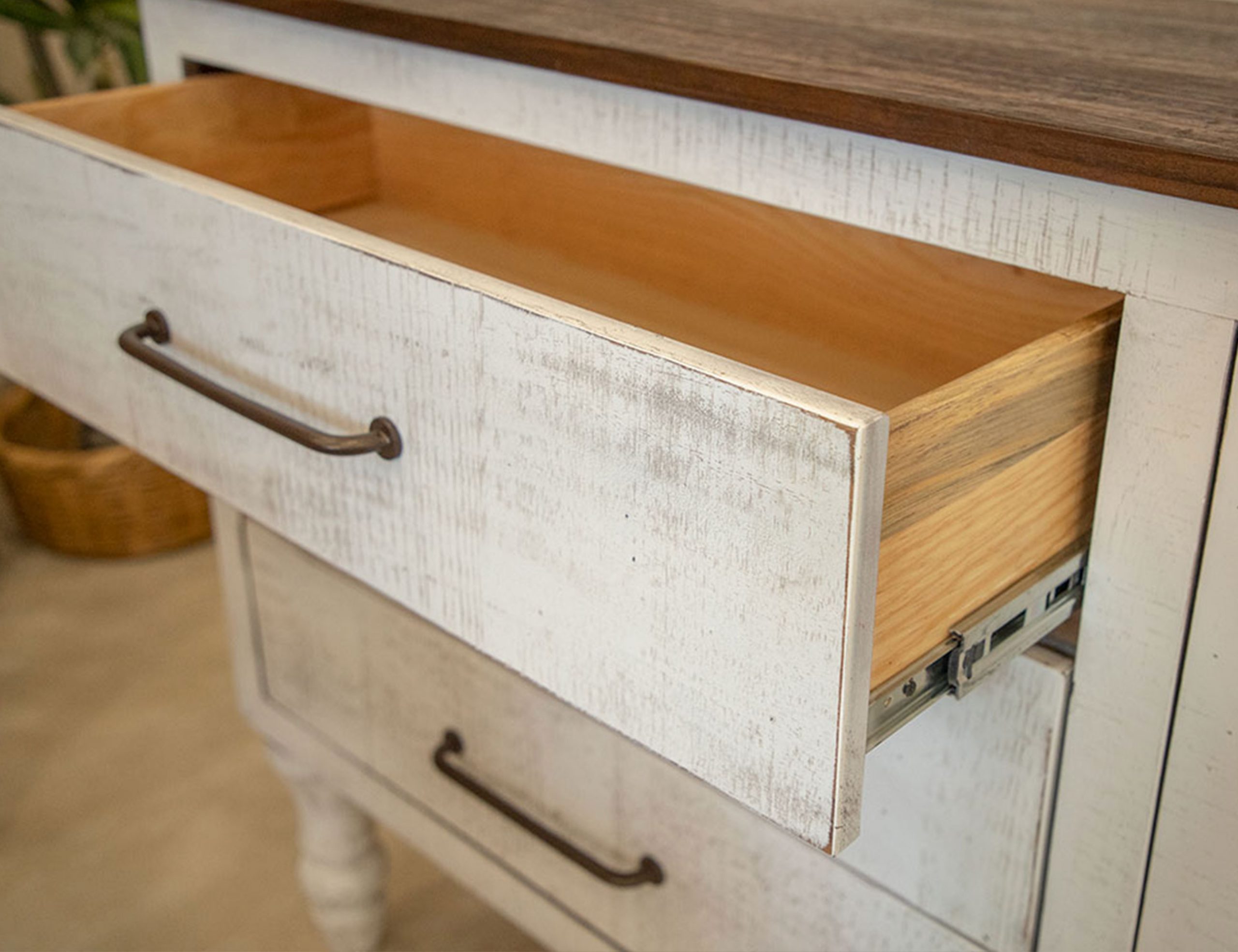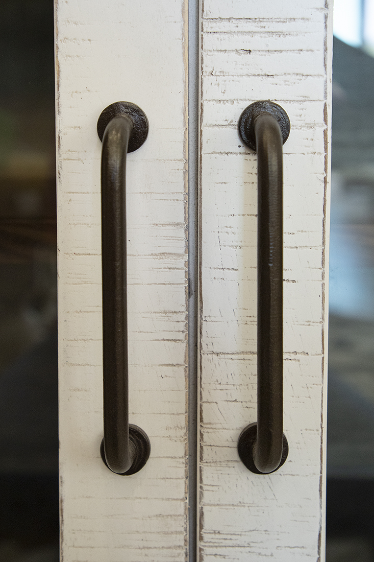 • Two tone, multi-step lacquer finish. Weathered white finish on hand- distressed wood.