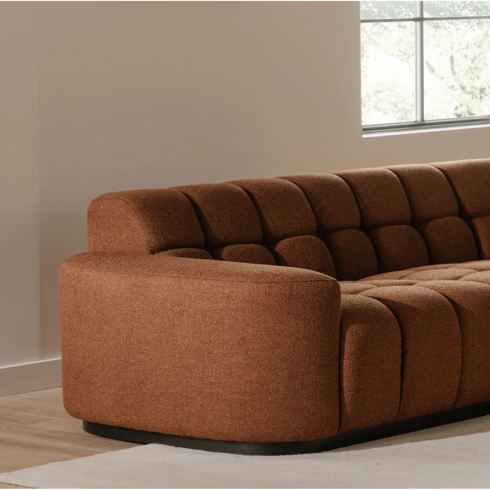The Roman L-shaped sectional is all about versatility, meticulously designed in five pieces. This piece nods to vintage and modernist aesthetics, featuring classic square tufting that brings depth and texture to any living space. The wide, curved arm profile introduces an element of softness, elegantly contrasting with the geometric/grid-like detailing. Topped with plush seating, it promises unparalleled comfort and style.