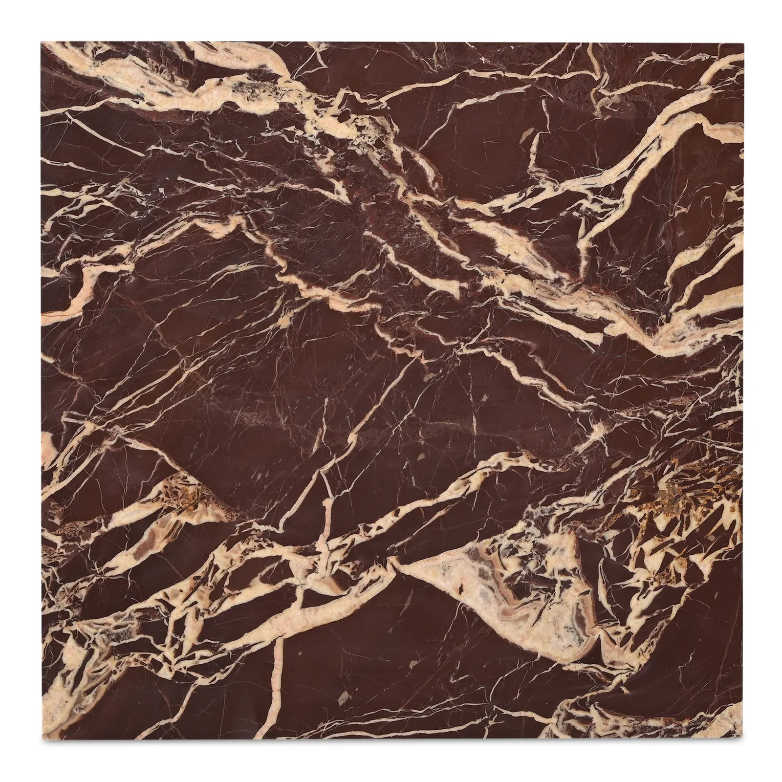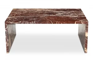 The bold simplicity of the waterfall design speaks volumes with the Rosa coffee table’s versatility. Crafted from beautiful Rosso Levanto marble, renowned for its vibrant red hue and striking gold veining, each piece is singularly impactful. This piece commands attention as a statement of natural elegance.