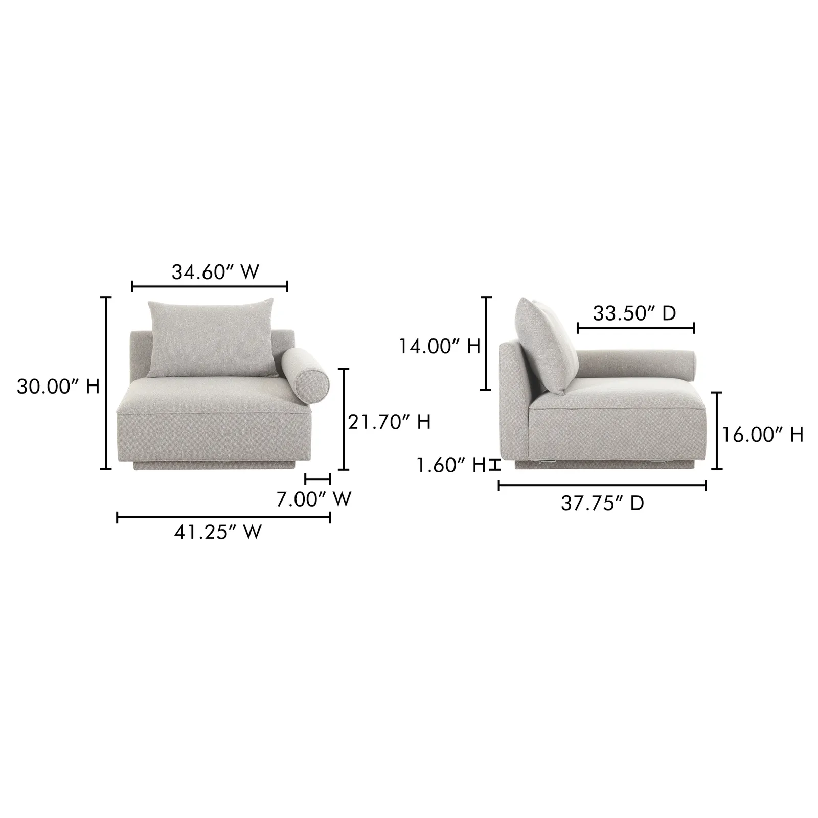 With its clean lines and bolster cushion arms, the Rosello right arm facing chair offers a versatile seating option with its transitional feel. Finished in a highly textured fabric, this piece adds depth and visual interest while ensuring optimal comfort and relaxation.