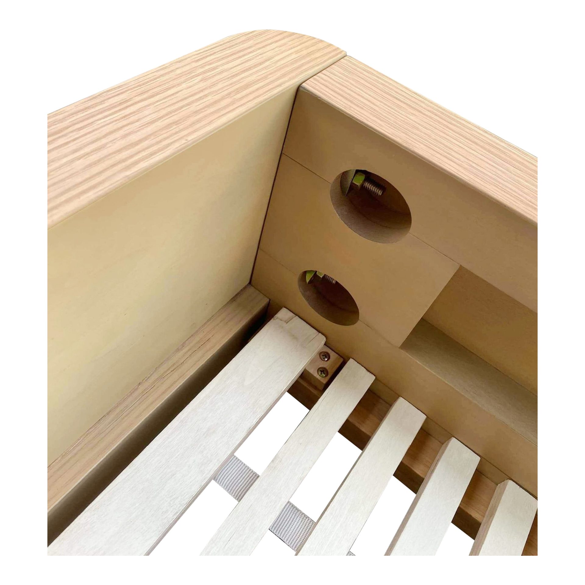 A soft, natural look for your bedroom. The Round Off collection is a showcase of organic oak, with the beautiful pale tones of the grain matched to a simple, comforting design. The low build and the softly molded corners of this queen bed give it an air of quiet sophistication, while the solid panel headboard is a perfect showcase for the wood’s fundamental beauty. As part of the Round Off bedroom collection, try pairing it up with the nightstand and dresser for a complete look. Natural beauty and character come together to promote mellow relaxation in the most personal room of your home.