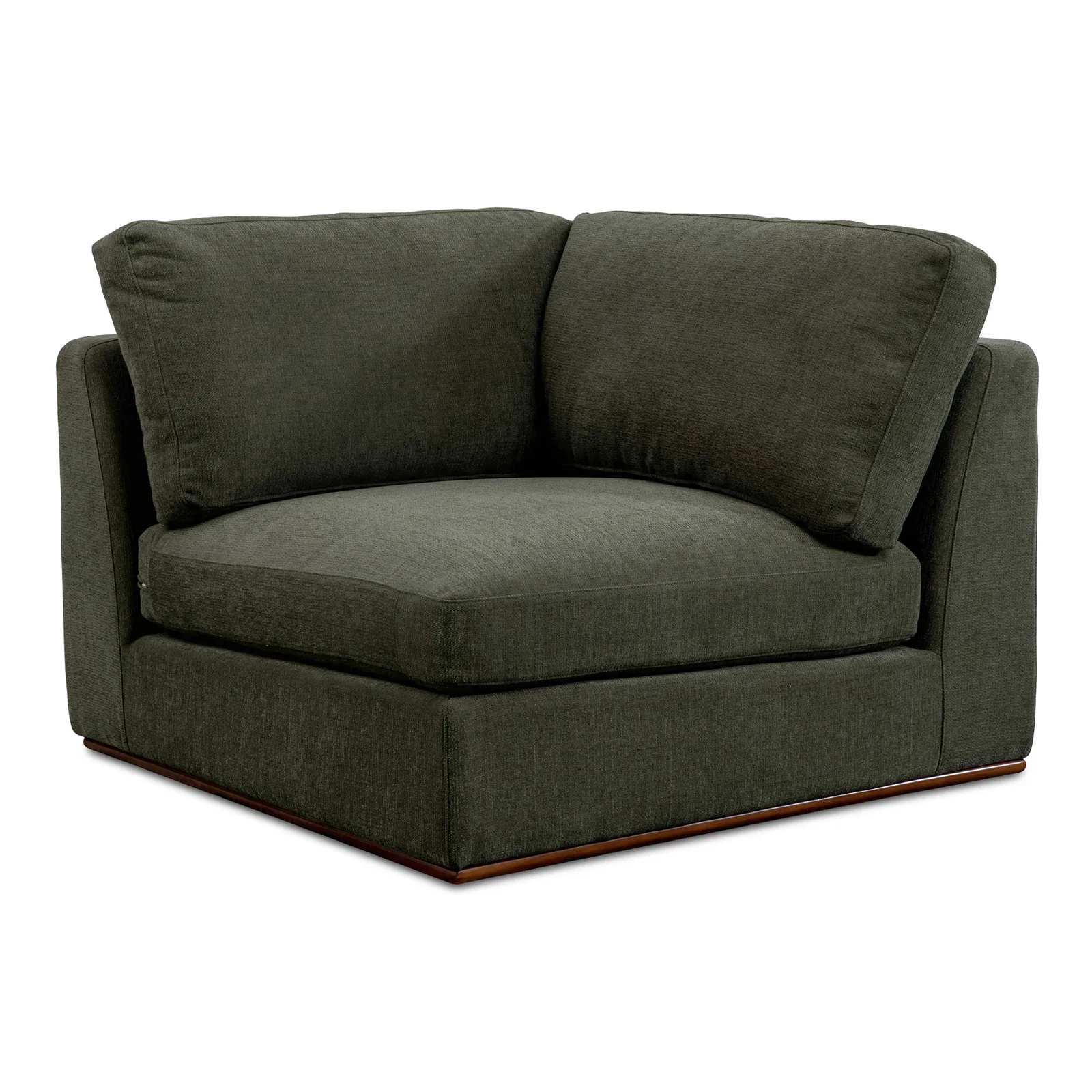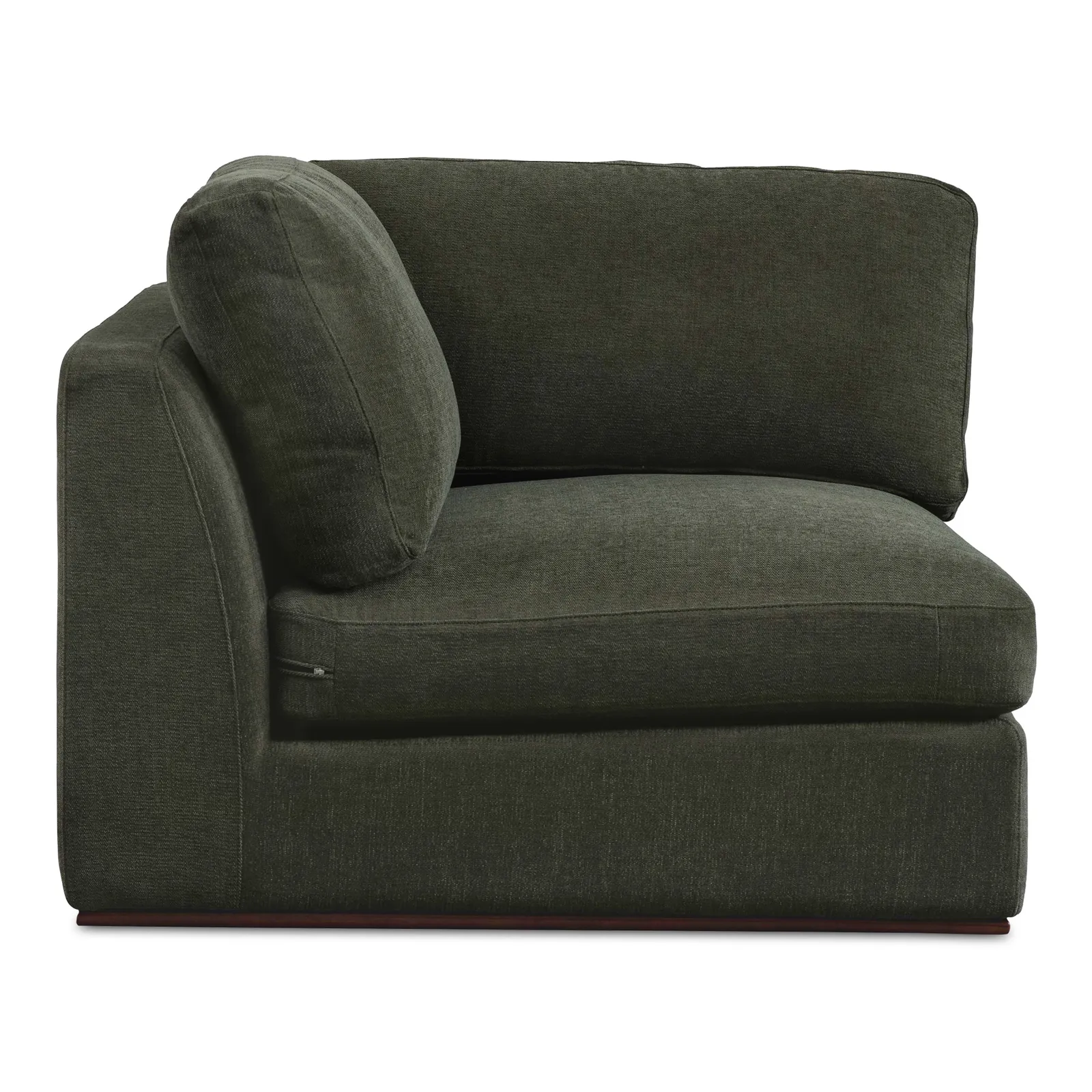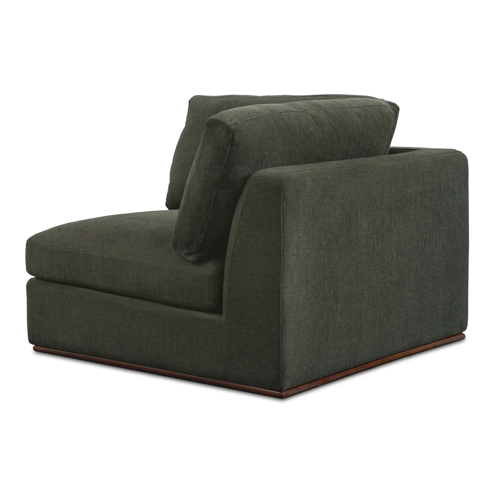 The Rue chair features a generous 70% feather-fill topper within its seat for an added layer of coziness. Its elegant silhouette is highlighted by a rubber wood base, creating a sleek floating appearance, all supported by subtle wooden legs. Designed with extreme comfort in mind, this modular chair embodies easy, neutral styling.
