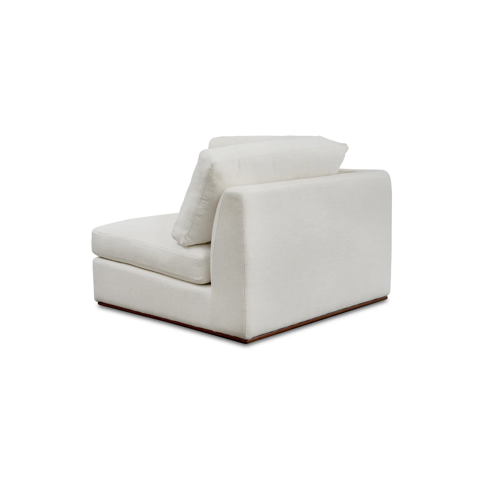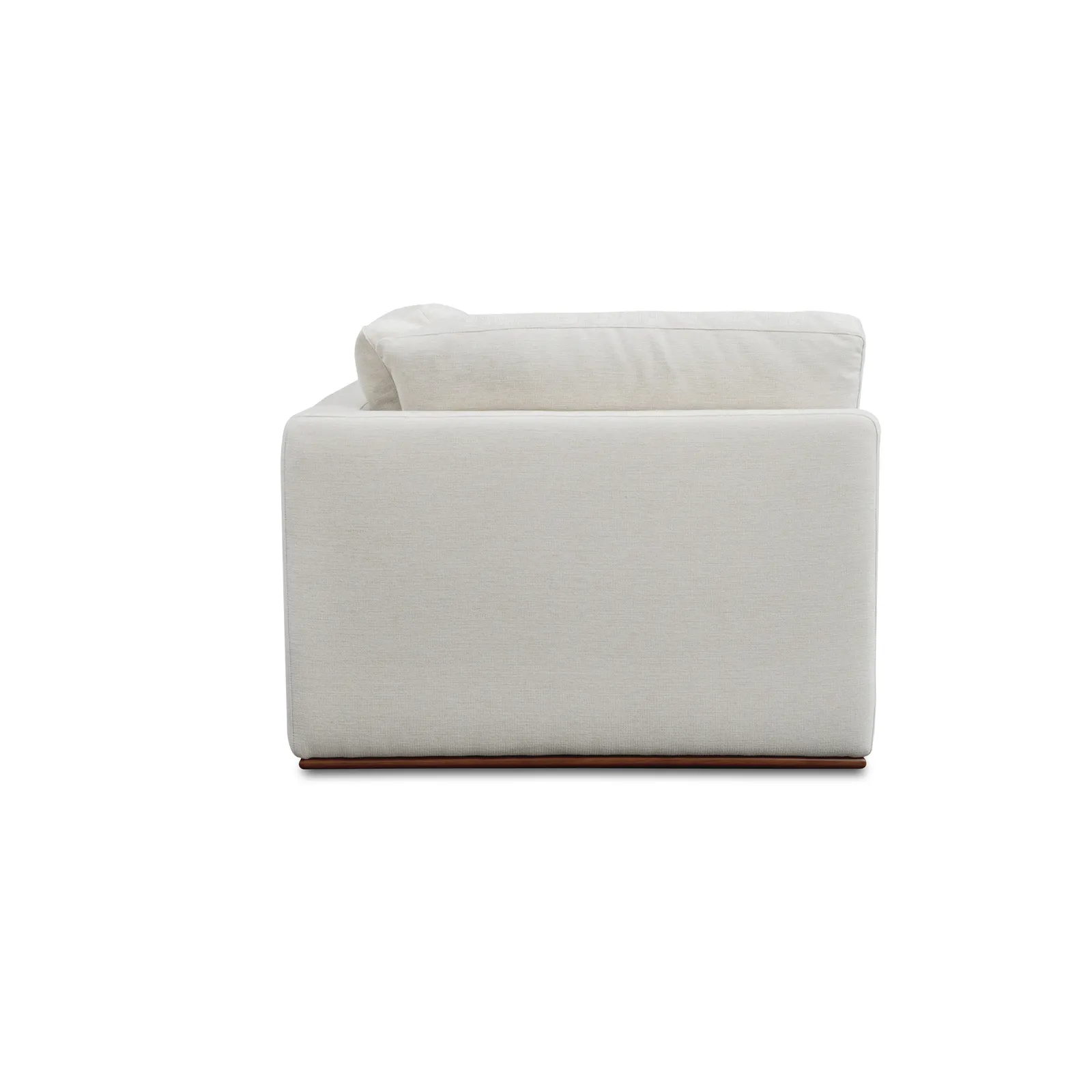 The Rue chair features a generous 70% feather-fill topper within its seat for an added layer of coziness. Its elegant silhouette is highlighted by a rubber wood base, creating a sleek floating appearance, all supported by subtle wooden legs. Designed with extreme comfort in mind, this modular chair embodies easy, neutral styling.