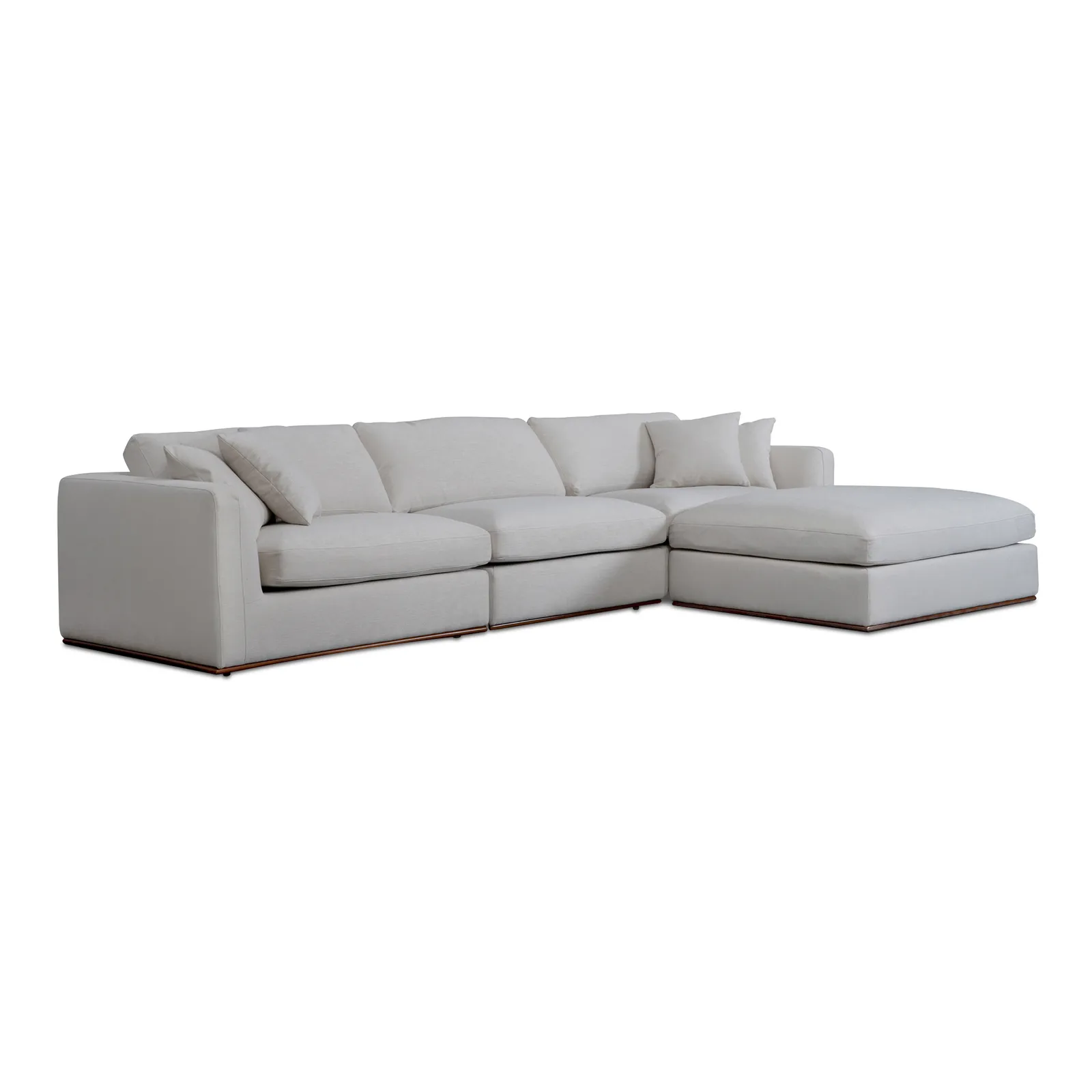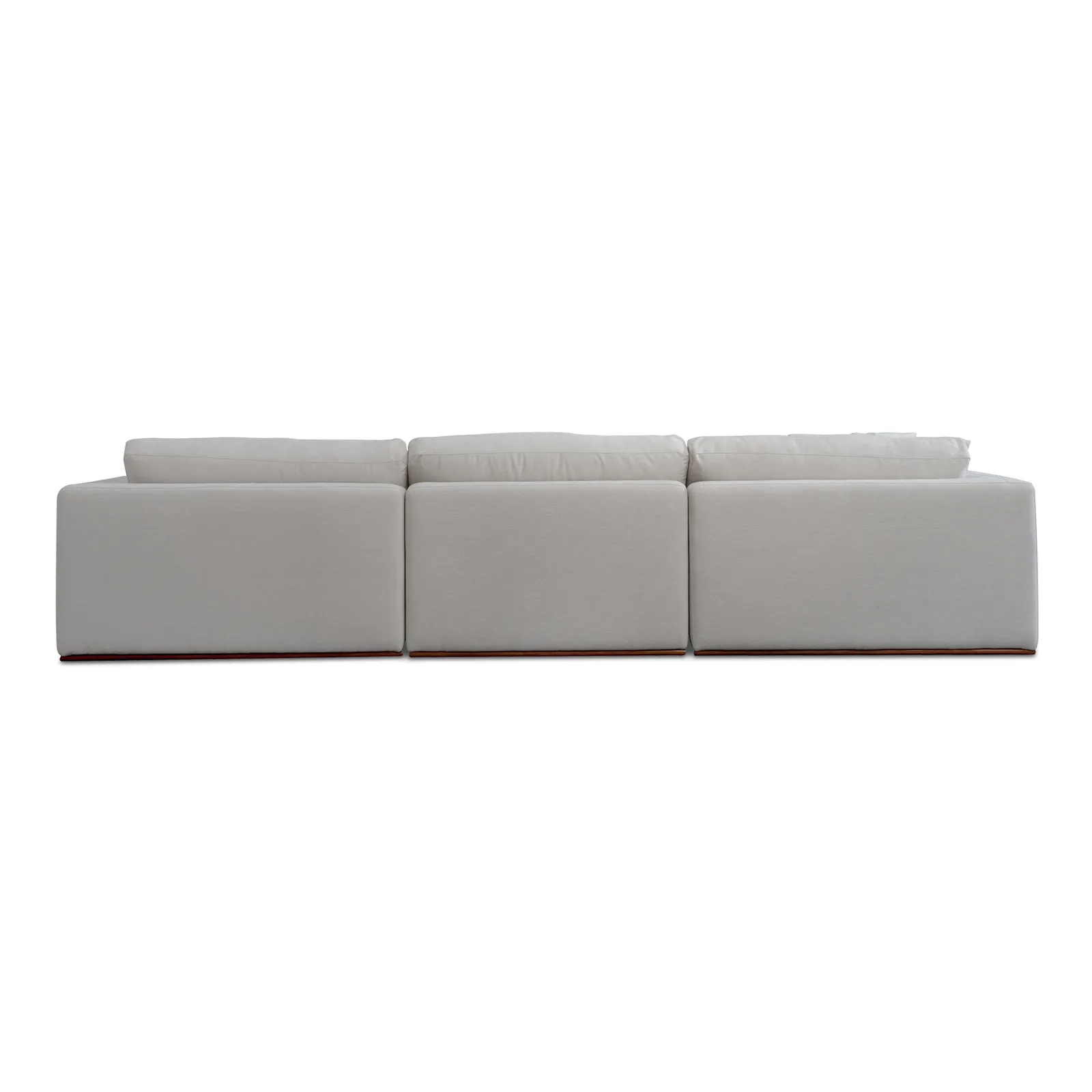 The Rue modular sectional features a generous 70% feather-fill topper within its bench seating, accompanied by toss cushions for an added layer of coziness. Its elegant silhouette is highlighted by a rubber wood base, creating a sleek floating appearance, all supported by subtle wooden legs. Designed with extreme comfort in mind, this modular embodies easy, neutral styling.