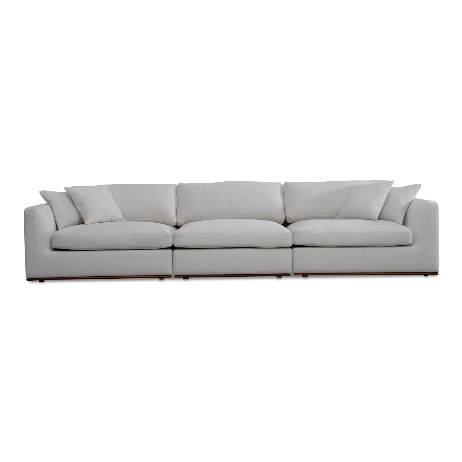 The Rue modular sectional features a generous 70% feather-fill topper within its seating, accompanied by toss cushions for an added layer of coziness. Its elegant silhouette is highlighted by a rubber wood base, creating a sleek floating appearance, all supported by subtle wooden legs. Designed with extreme comfort in mind, this modular embodies easy, neutral styling.