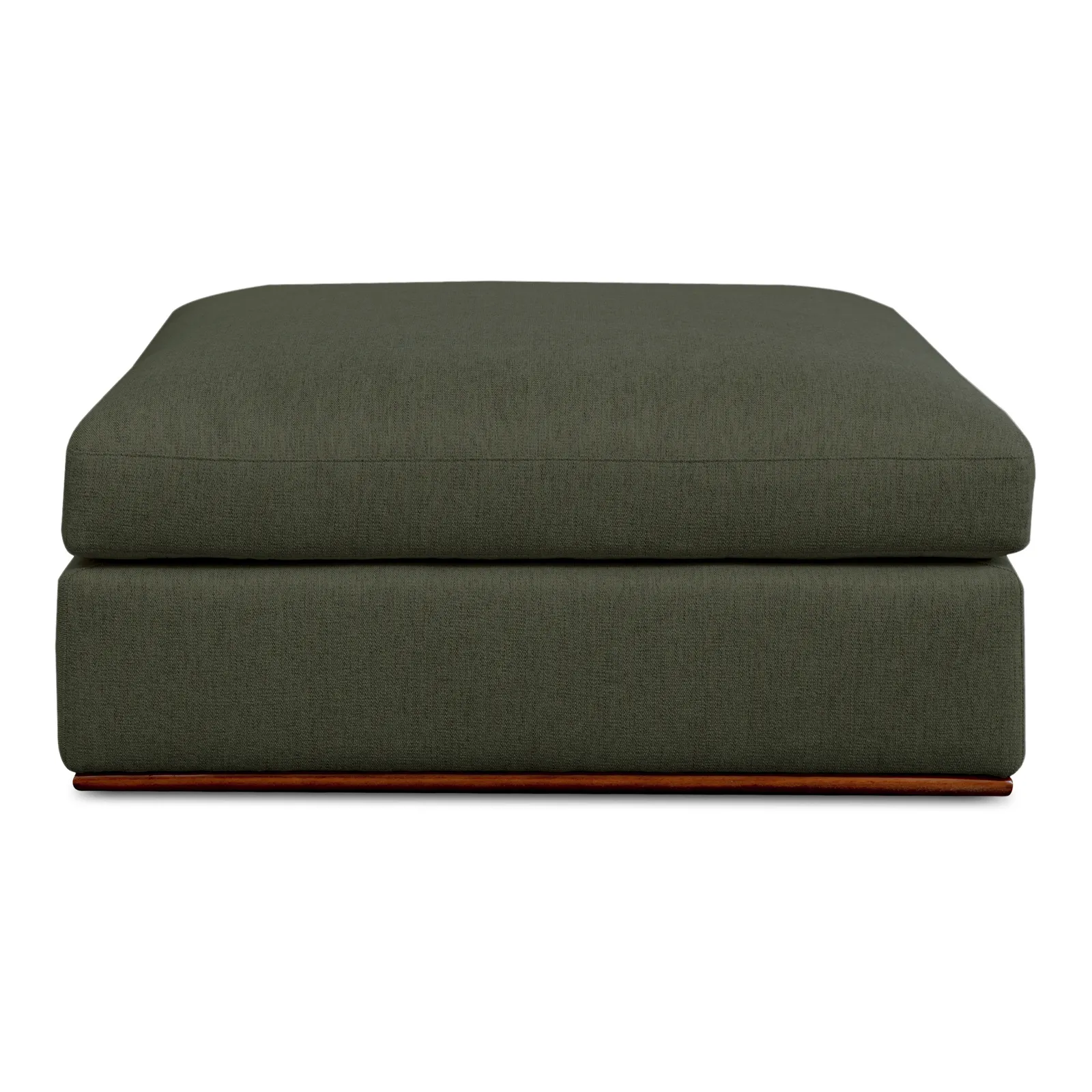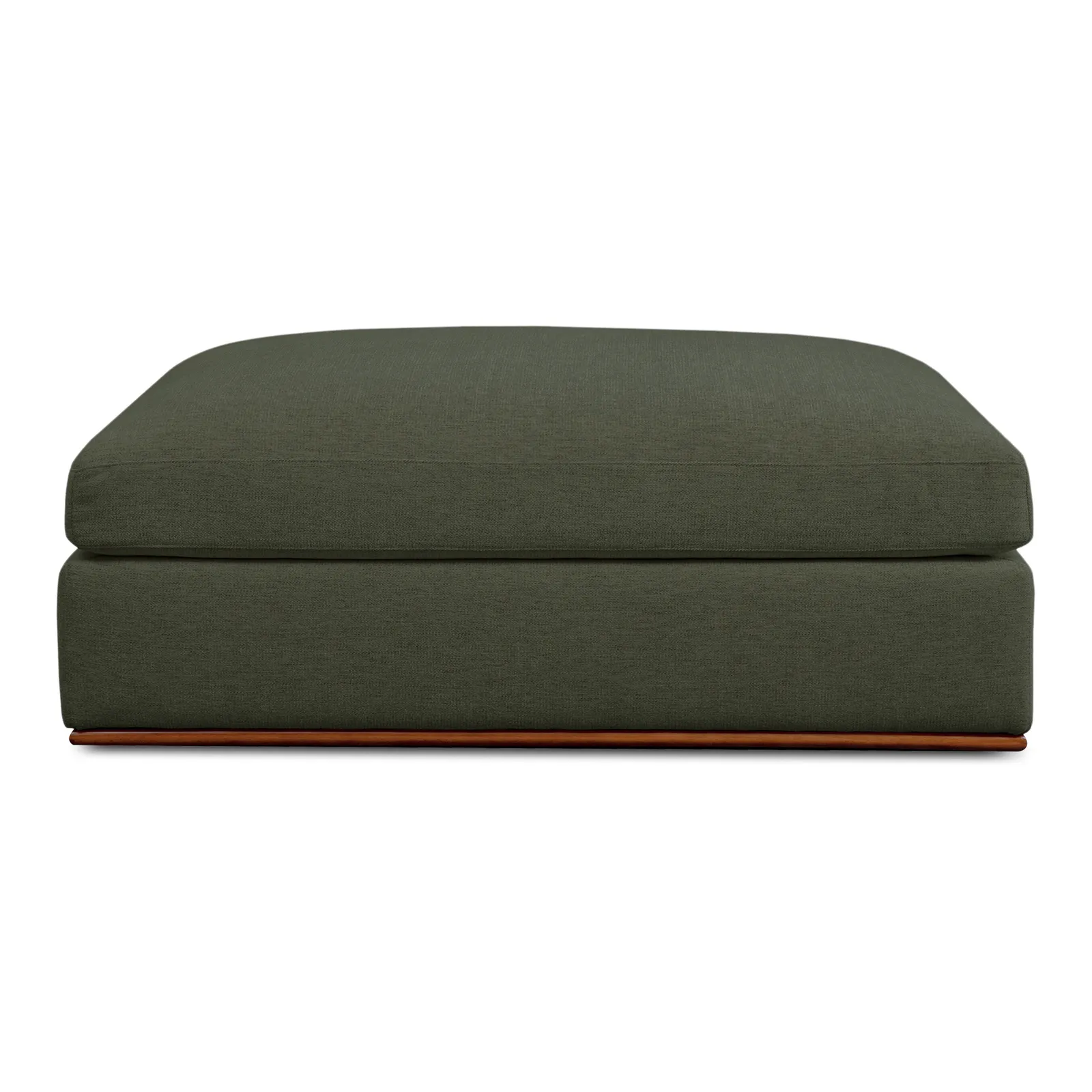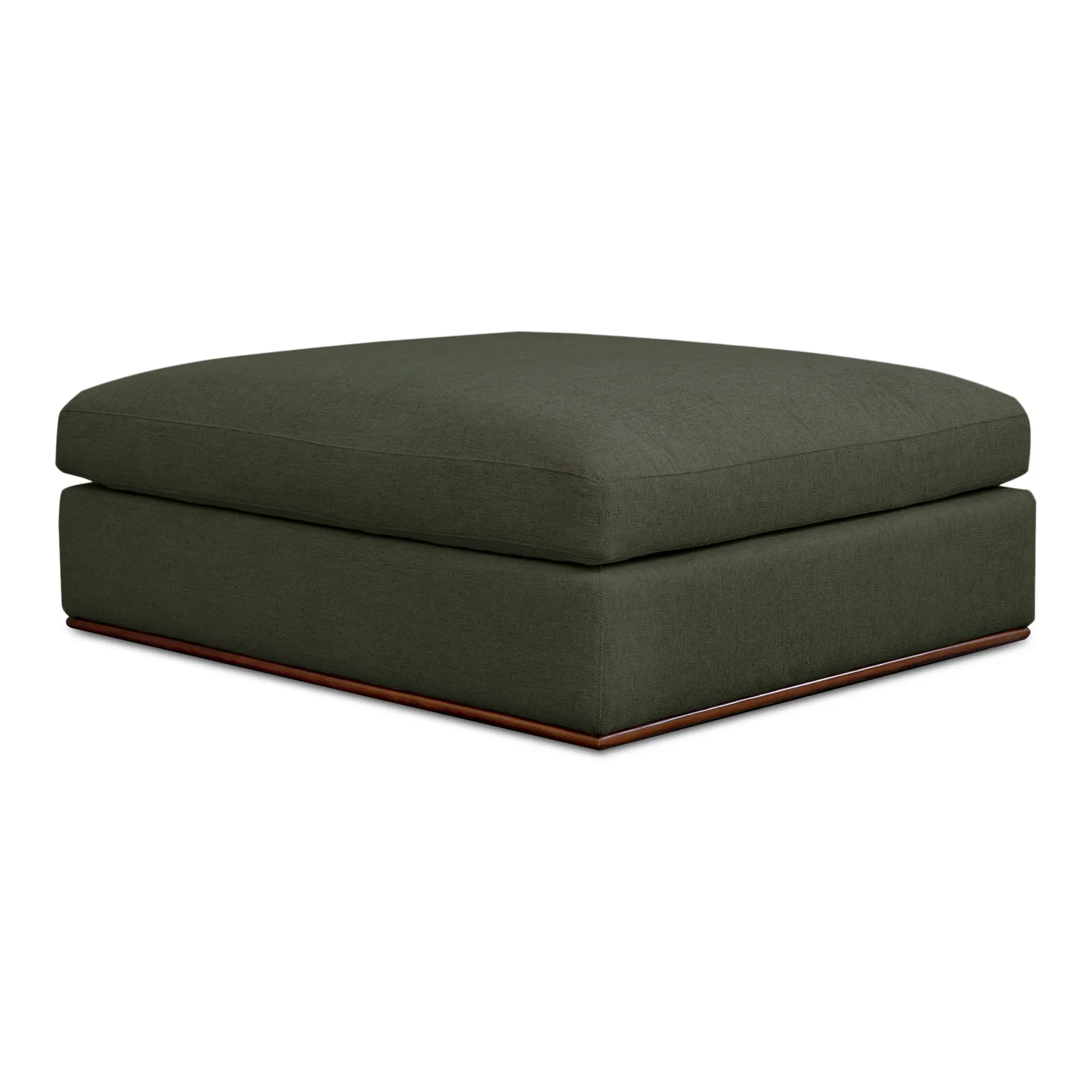 The Rue ottoman features a generous 70% feather-fill topper within its seat. Its elegant silhouette is highlighted by a rubber wood base, creating a sleek floating appearance, all supported by subtle wooden legs. Designed with extreme comfort in mind, this ottoman embodies easy, neutral styling.